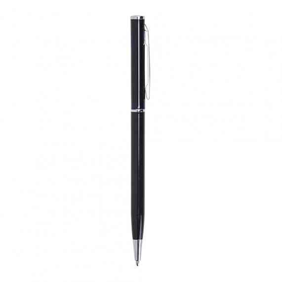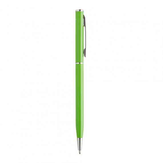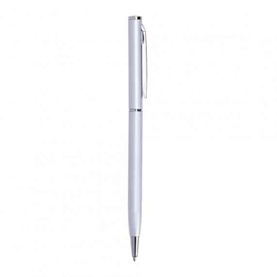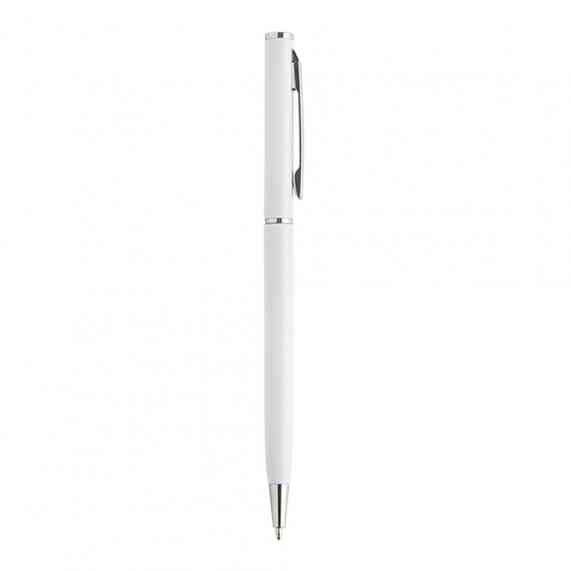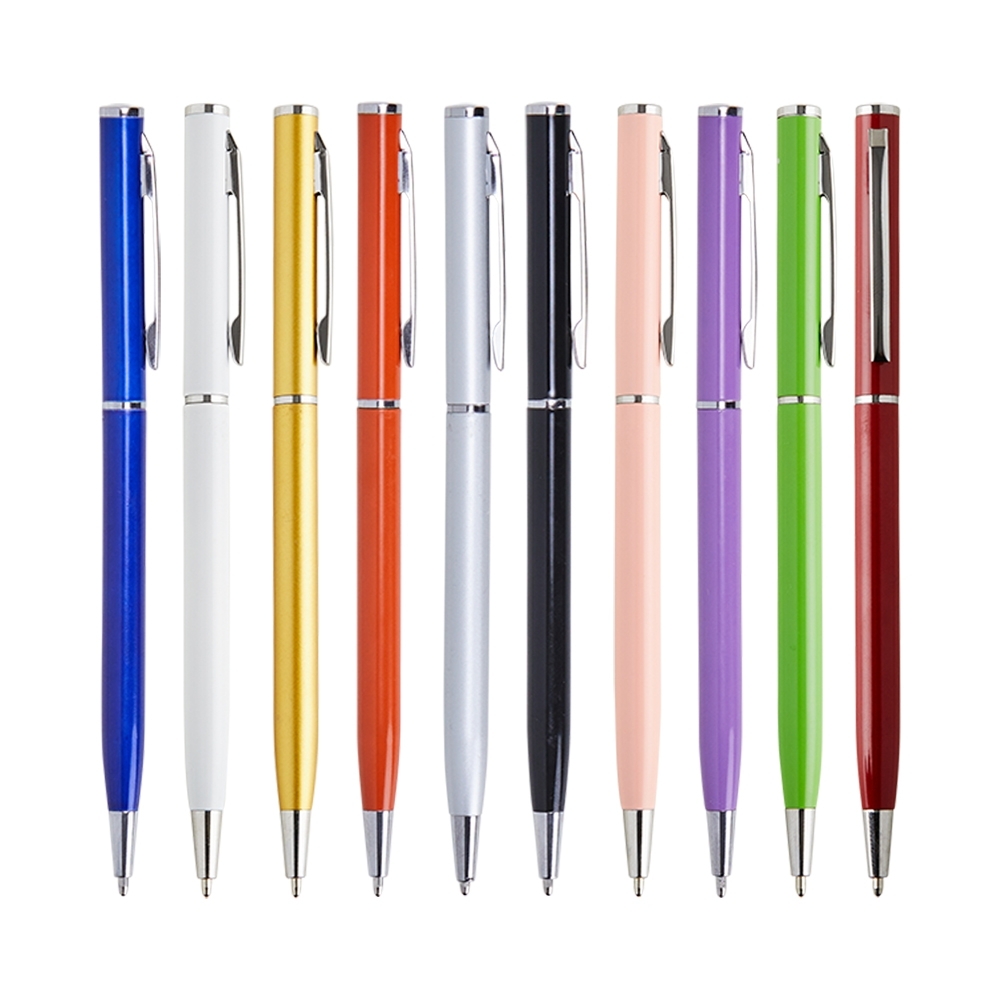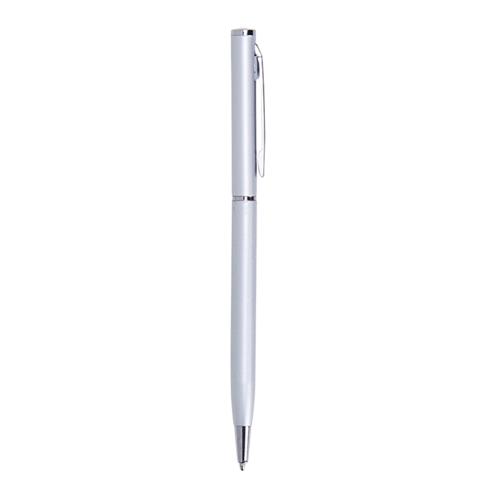 Caneta metálica com carga esferográfica azul 1.0mm e acionamento por rotação.
