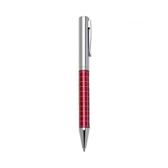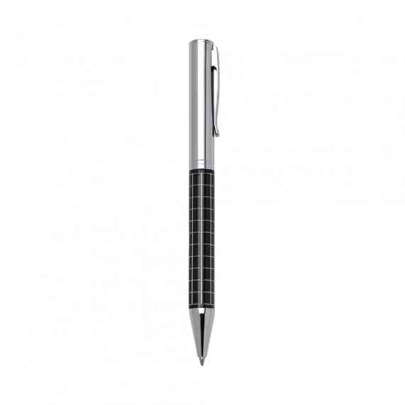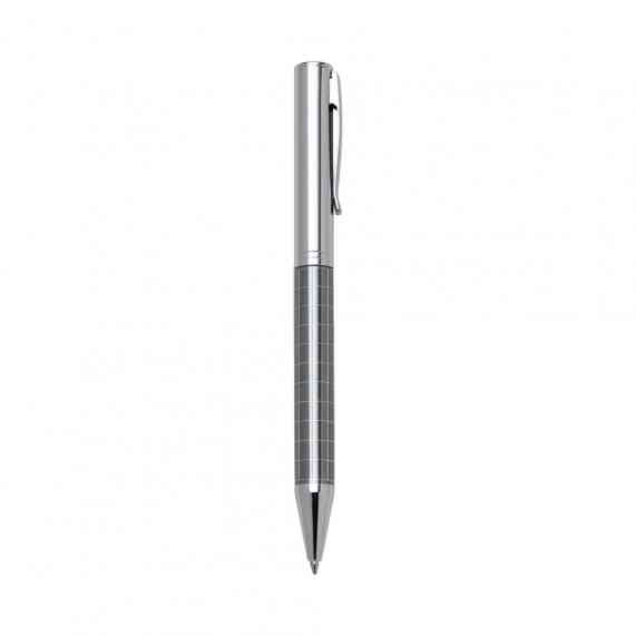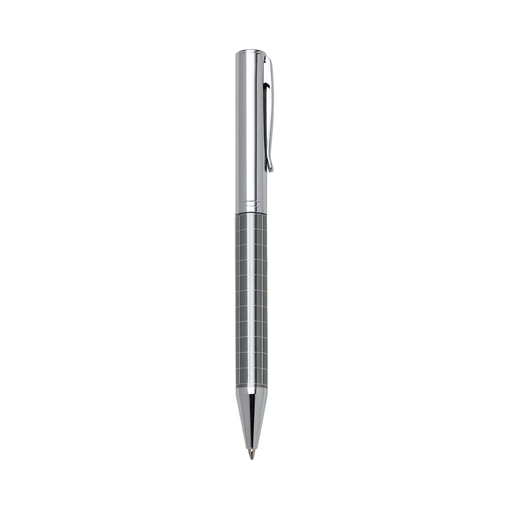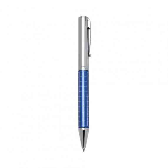 Caneta metálica com carga esferográfica azul e acionamento por rotação.
