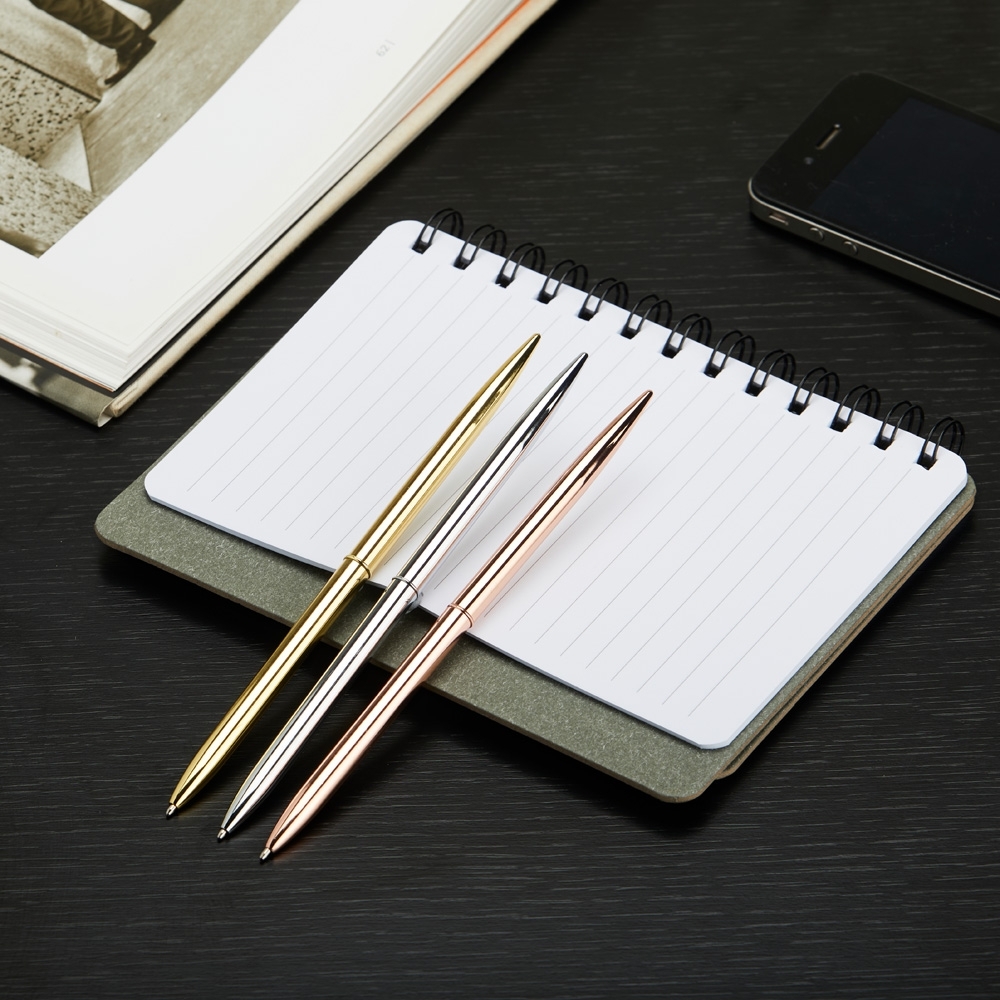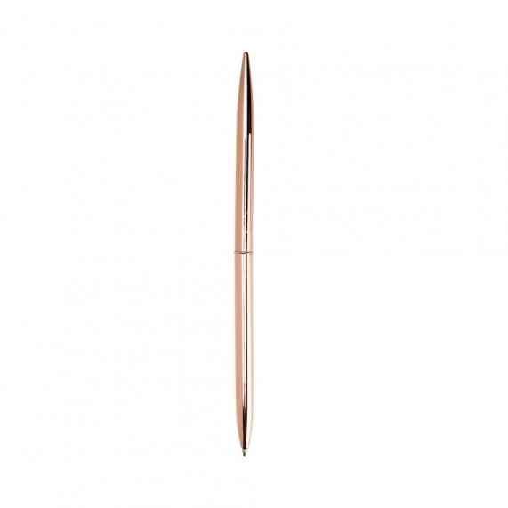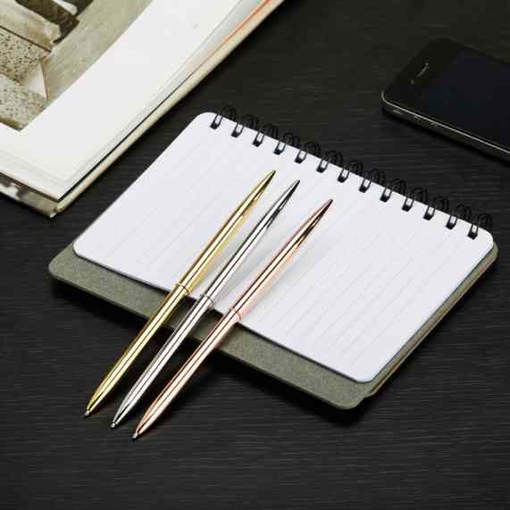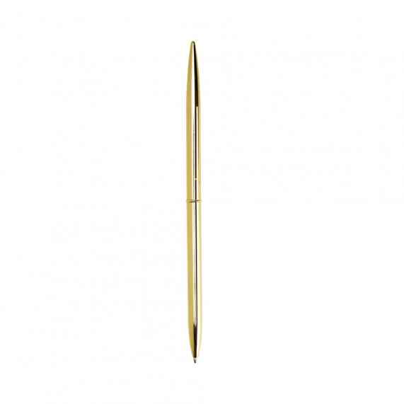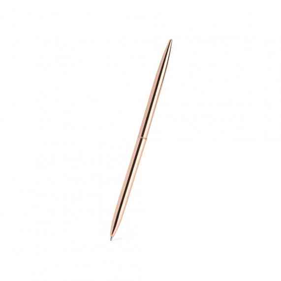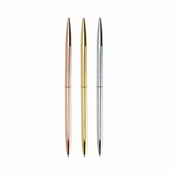 Caneta metálica com acionamento por rotação e carga esferográfica azul 1mm.
