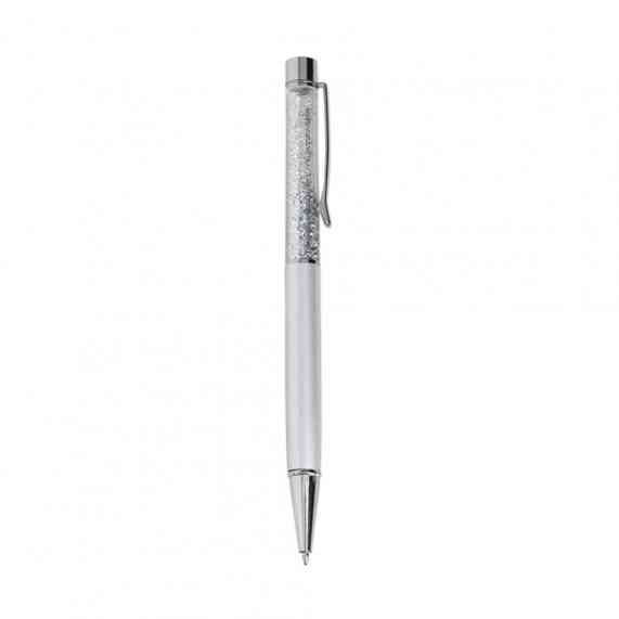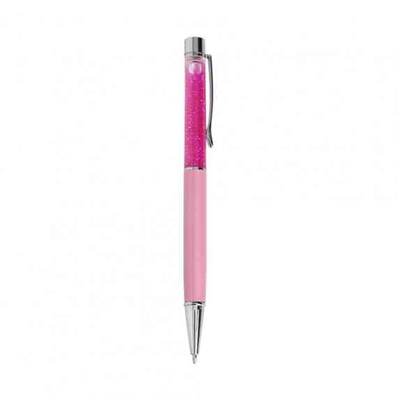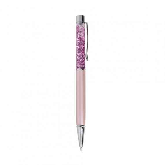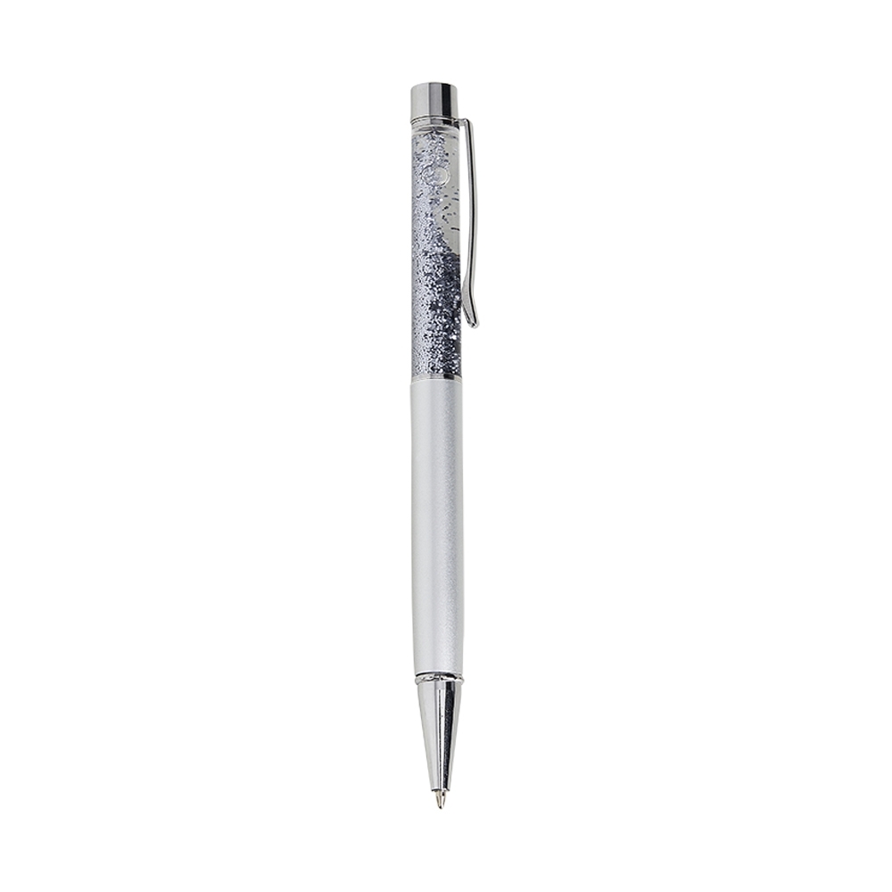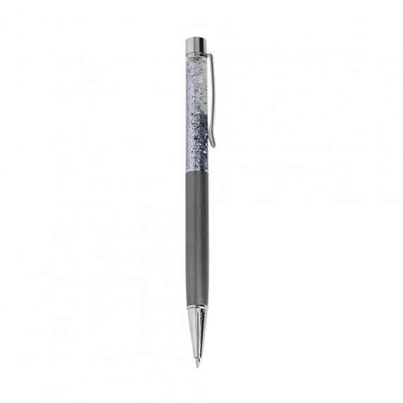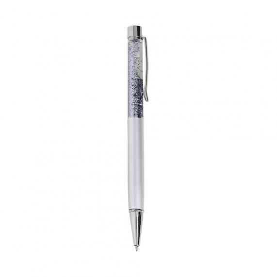 Caneta metálica com glitter, acionamento por rotação e carga esferográfica 1.0mm azul.