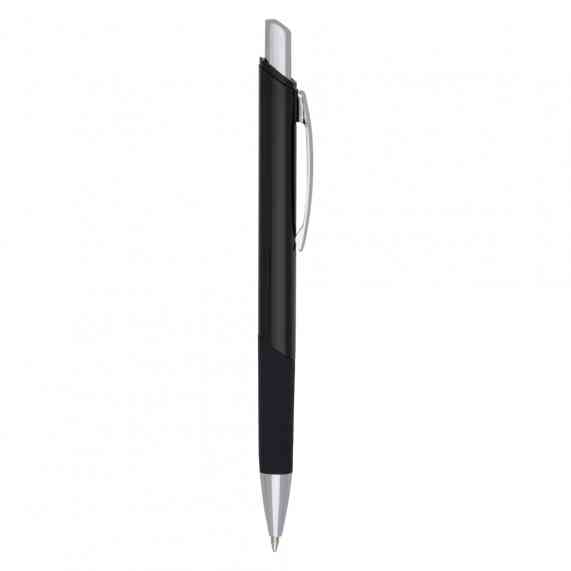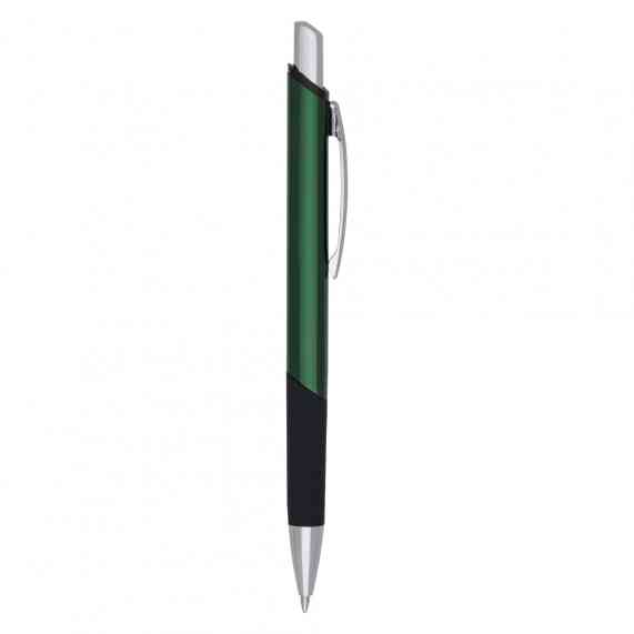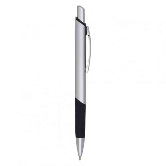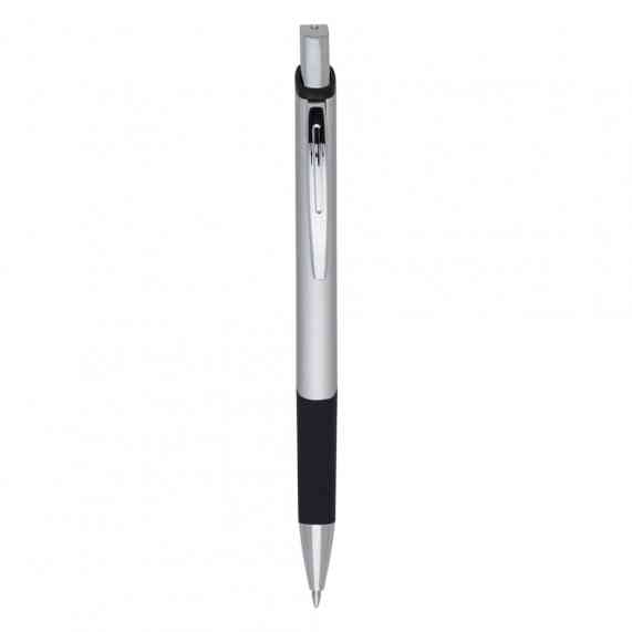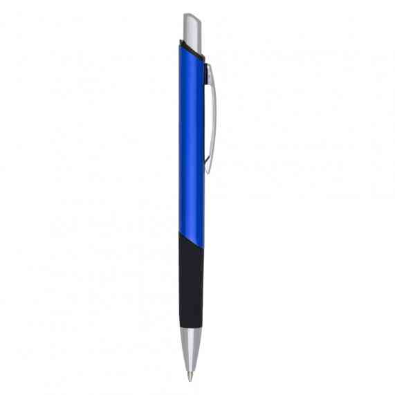 Caneta metálica com design quadrangular, acabamento brilhante (exceto a prata) e detalhe emborrachado, carga esferográfica azul e acionamento por clique.