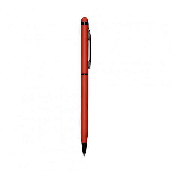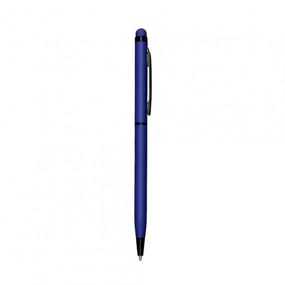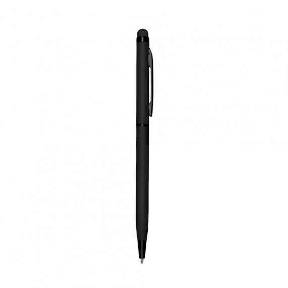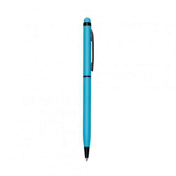 Caneta metálica com touch screen, carga esferográfica azul e acionamento por rotação.