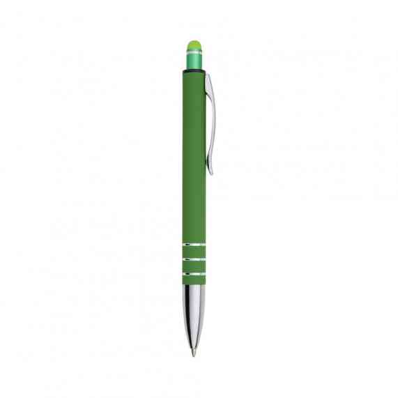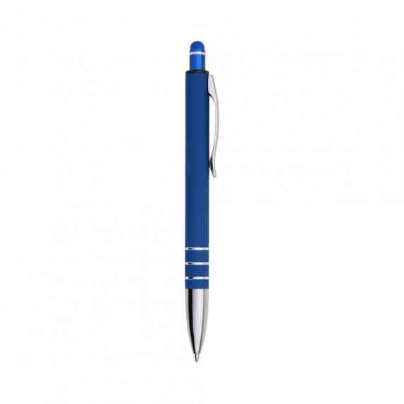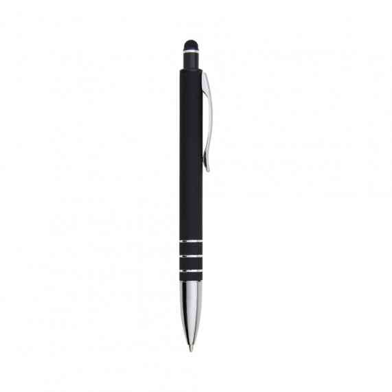Caneta metálica touchscreen com acabamento emborrachado, acionamento por clique e carga esferográfica azul 1.0mm.