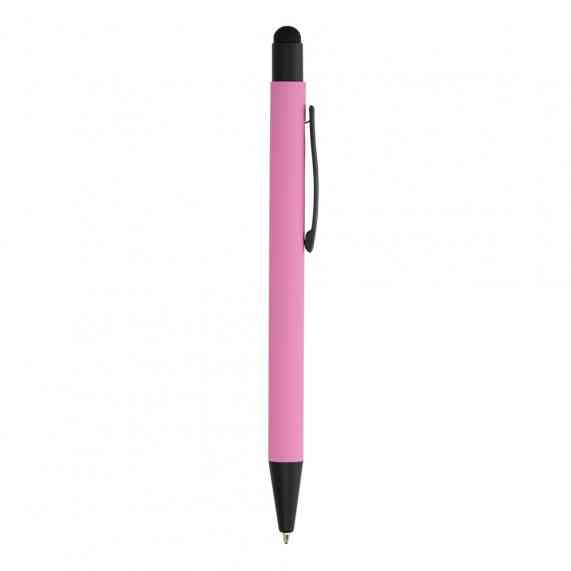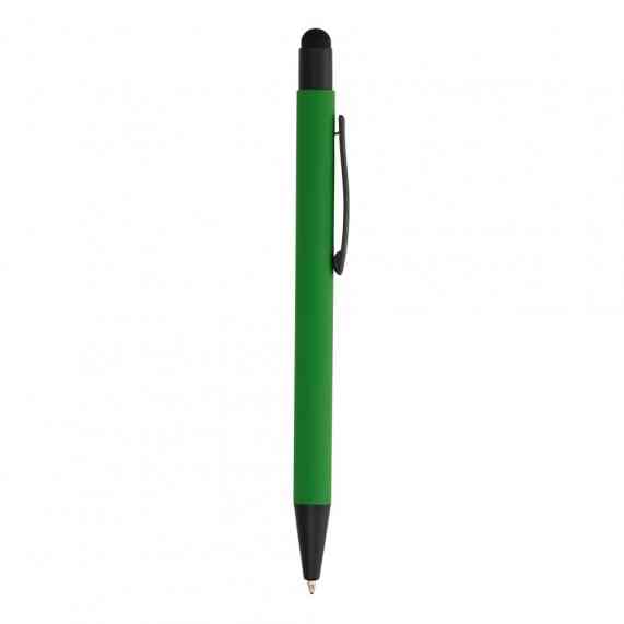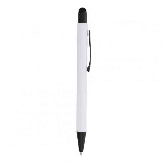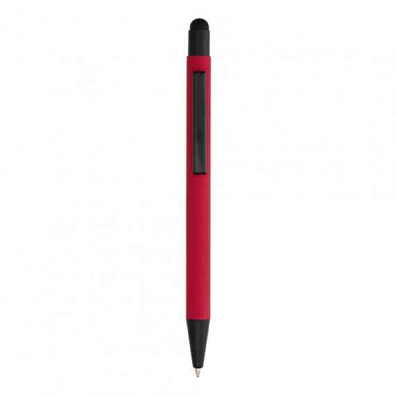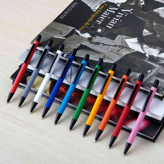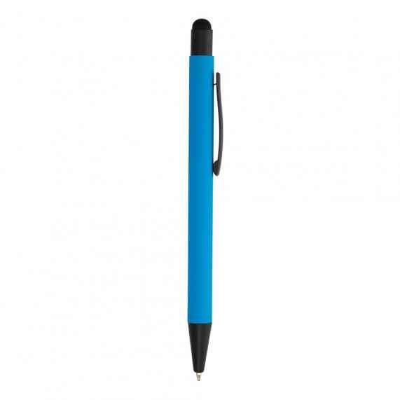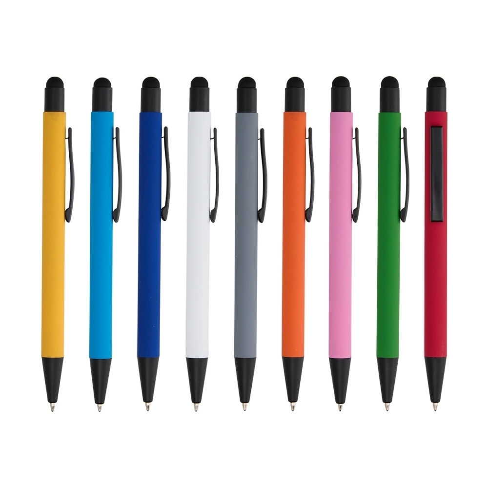 Caneta metálica touchscreen com acabamento emborrachado, acionamento por clique e carga esferográfica azul 1.0mm.