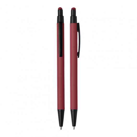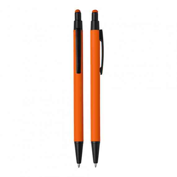 Caneta esferográfica em metal Emborrachada com ponta touch escrita em azul.