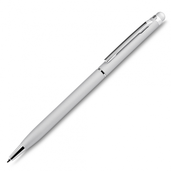 Caneta esferográfica de metal escrita em azul, emborrachada, touch