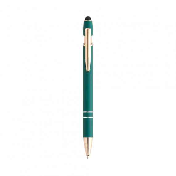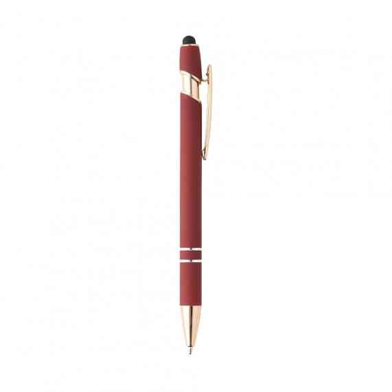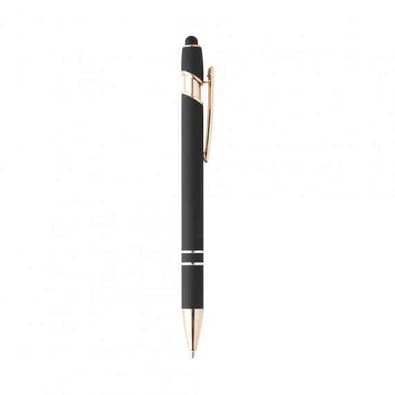 Caneta metálica touchscreen com acabamento similar à borracha, acionamento por clique e carga esferográfica azul 1.0mm.