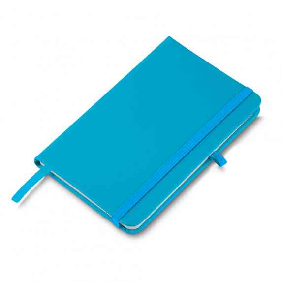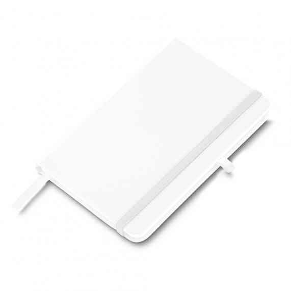 Caderno de anotações com elástico no tamanho A5, suporte para caneta, capa dura em material sintético, miolo 80 folhas pautadas na cor bege.