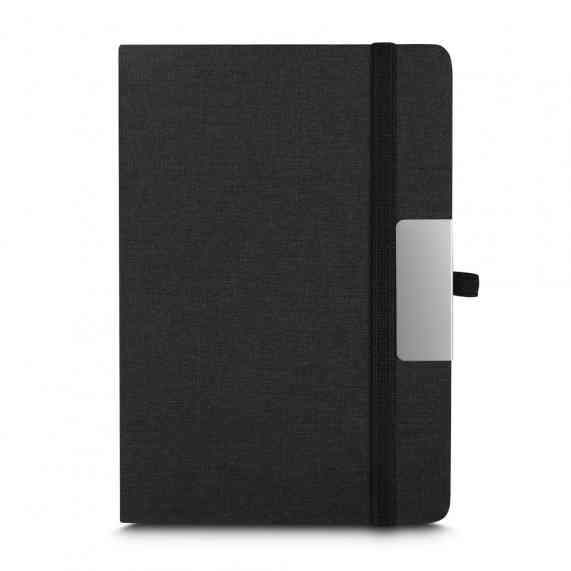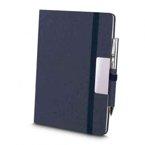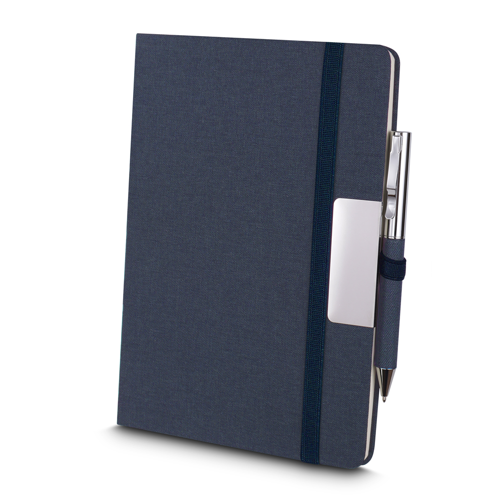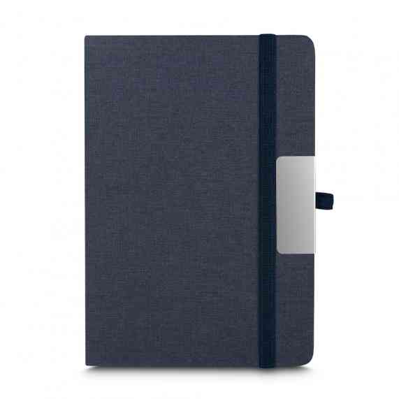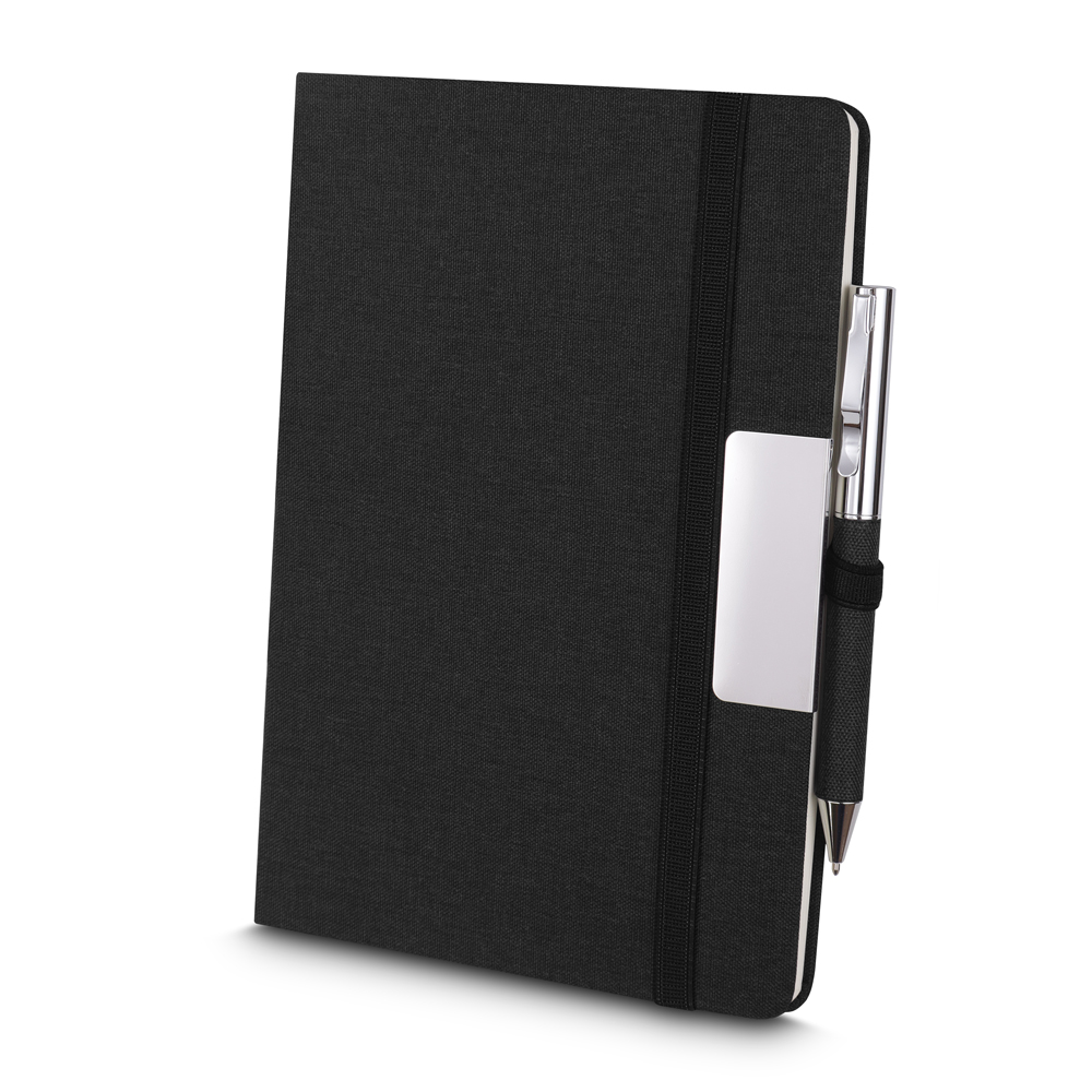 O caderno de anotações é feito de PET Reciclado, acompanha placa em metal, em capa dura com miolo 80 folhas pautadas.