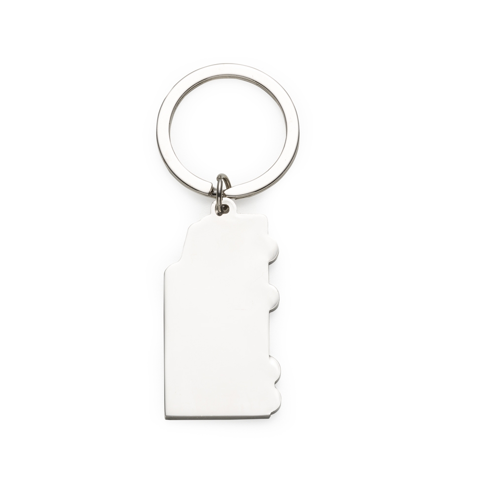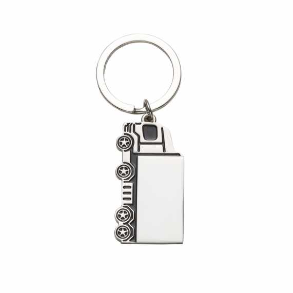 Chaveiro metal com chapa em formato caminhão brilhante, possui detalhes preto em relevo na frente e verso liso.