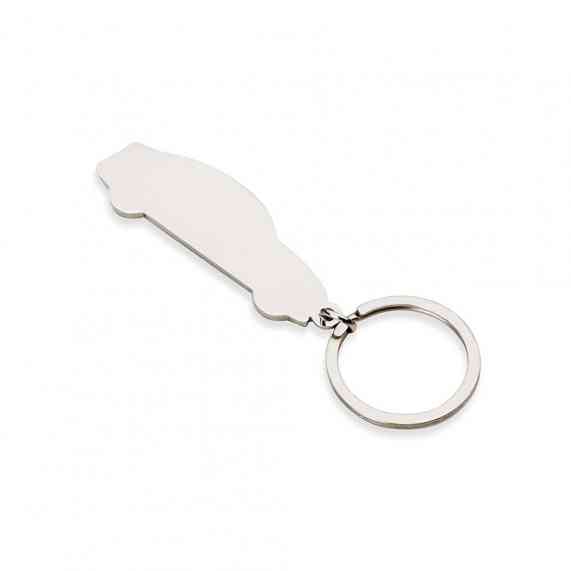 Chaveiro metal formato carro com detalhes preto em relevo e verso espelhado.