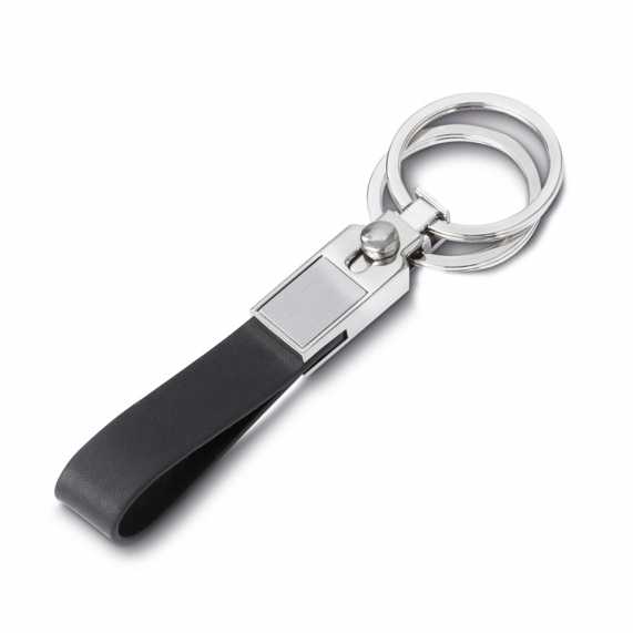 Chaveiro de metal com couro sintético preto com 2 argolas + caixa com berço aveludado. Engate rápido para uma argola. Área disponível para gravação em aço escovado.