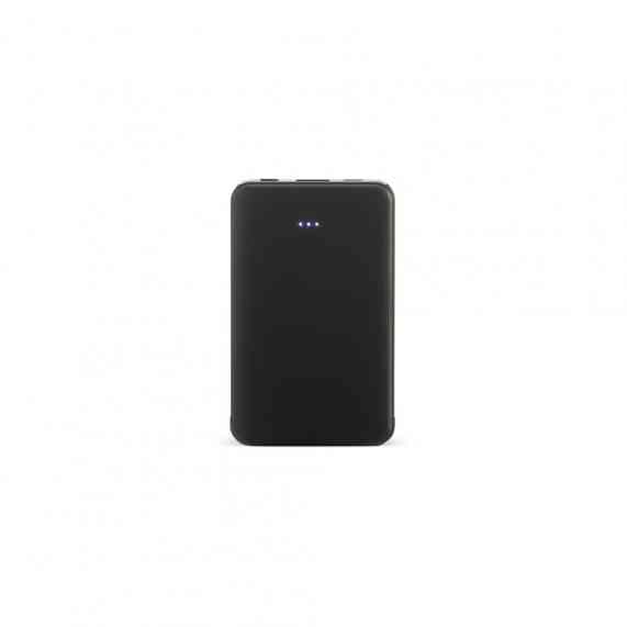 Power bank plástico de 5.000mAh com indicadores led de bateria e cabos acoplados: Tipo-C e V8. Acompanha cabo USB V8 e adaptador Lightning.