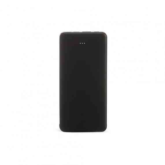Power bank plástico de 10.000mAh com indicadores led de bateria e cabos acoplados: Tipo-C e V8. Acompanha cabo USB V8 e adaptador Lightning.