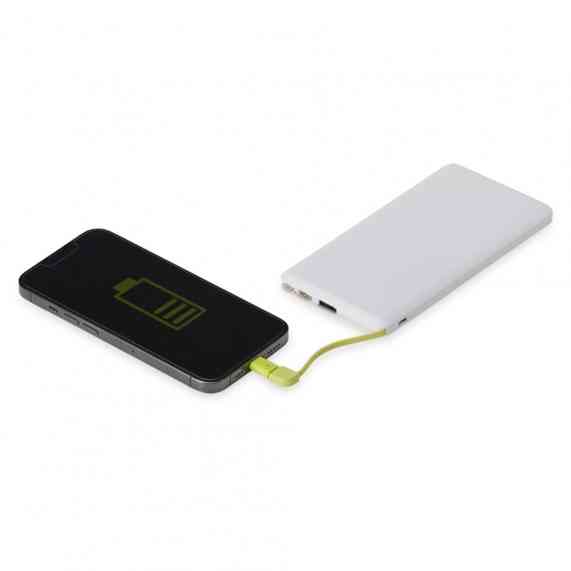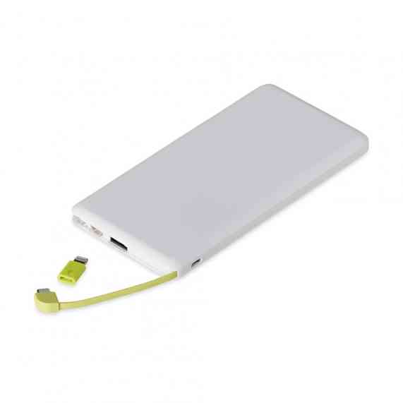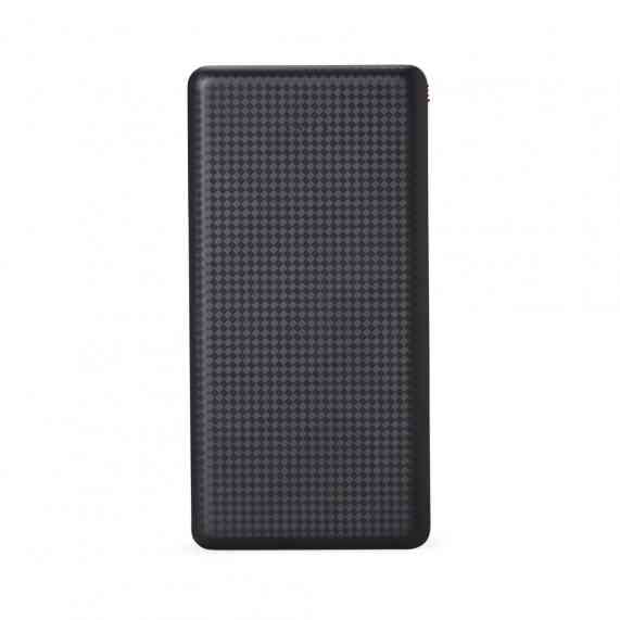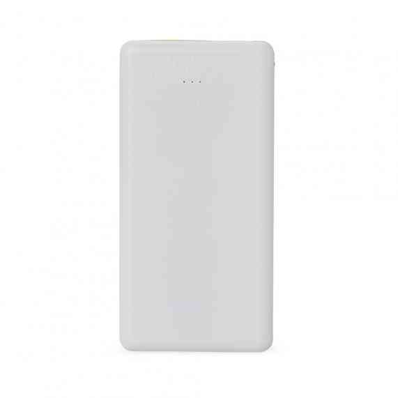 Carregador portátil plástico com 10.000mAh e indicador led de bateria. Possui entrada V8, acompanha cabo USB, adaptador lightning e adaptador tipo-C.