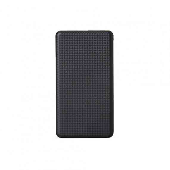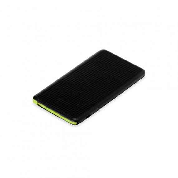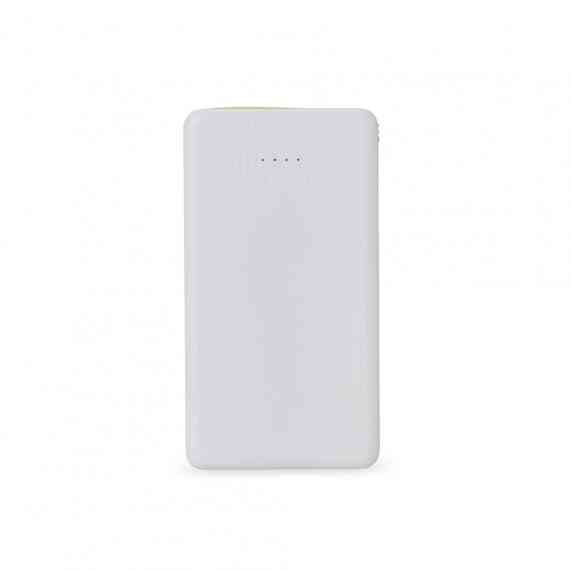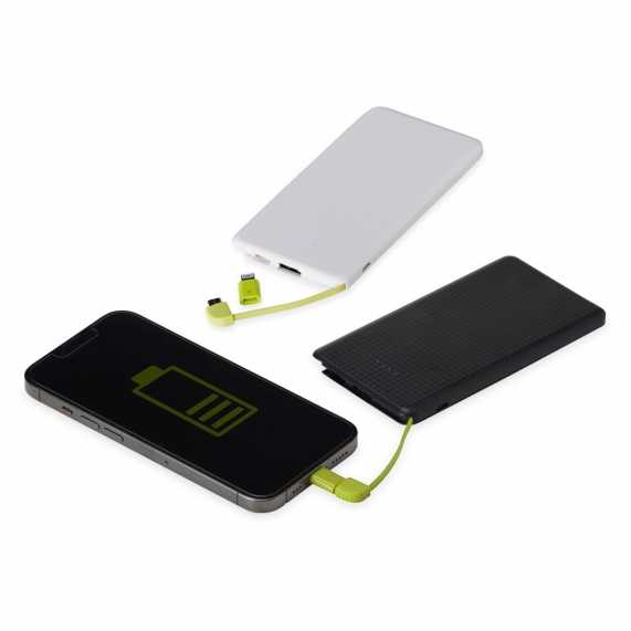 Carregador portátil plástico com 5.000mAh e indicador led de bateria. Possui entrada V8, acompanha cabo USB e adaptador lightning.