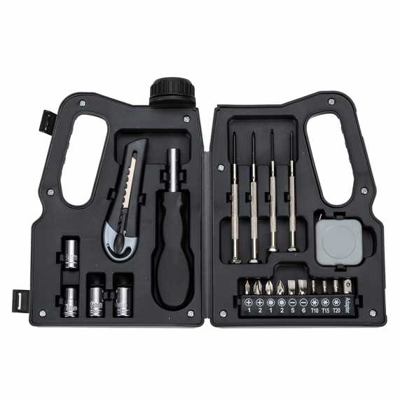 Kit ferramenta 21 peças em estojo formato garrafa de óleo. Material plástico resistente com detalhes em relevo(tampa faz apenas parte do design), possui duas travas para abertura e acompanha: estilete, chave canhão, 4 extensores bocais(7MM, 8MM, 9MM e 10MM), 2 mini chaves de fenda e 2 mini chaves phillips e conjunto 10 pontas(4 chaves phillips, 2 chaves fenda, 3 chaves torx e um adaptador).