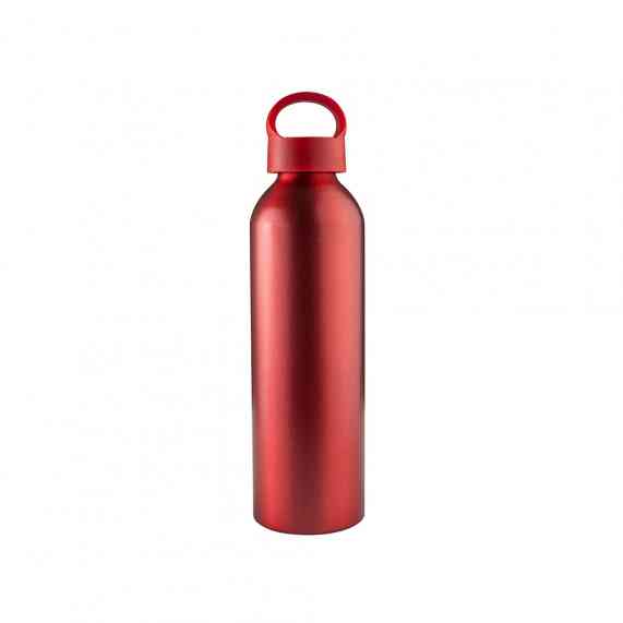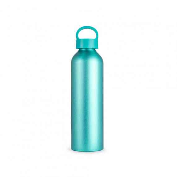 Garrafa de alumínio 630ml. Possui tampa plástica rosqueável com alça integrada.