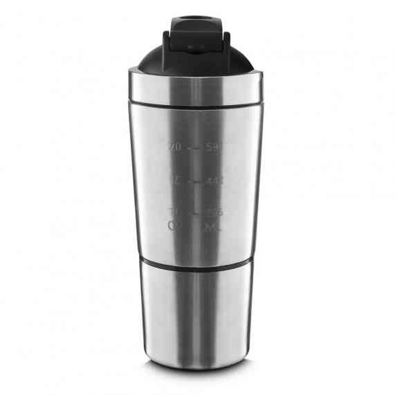 Garrafa coqueteleira em aço inox para proteína com capacidade da garrafa de até 750ml e copo com capacidade de 200ml, acompanha mola para mistura e medidor gavado na parede da garrafa.