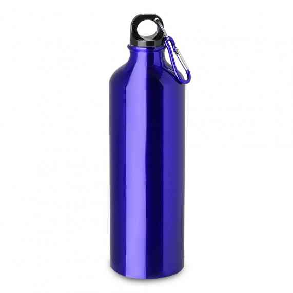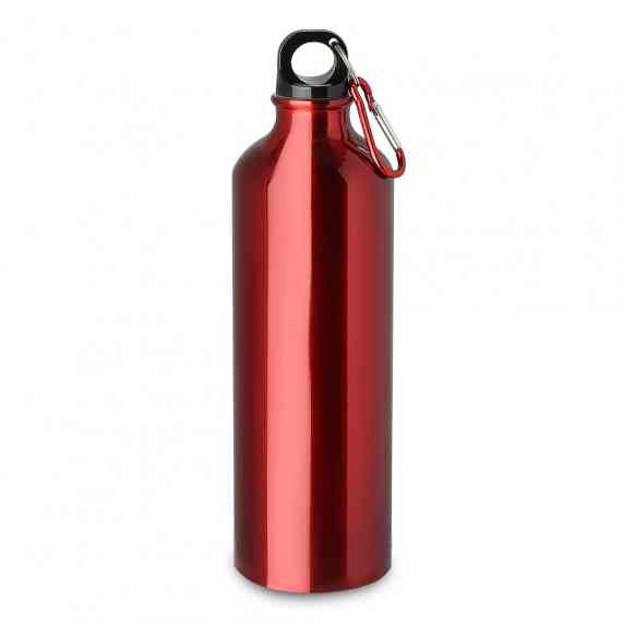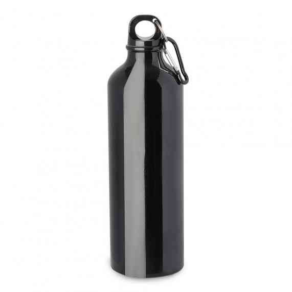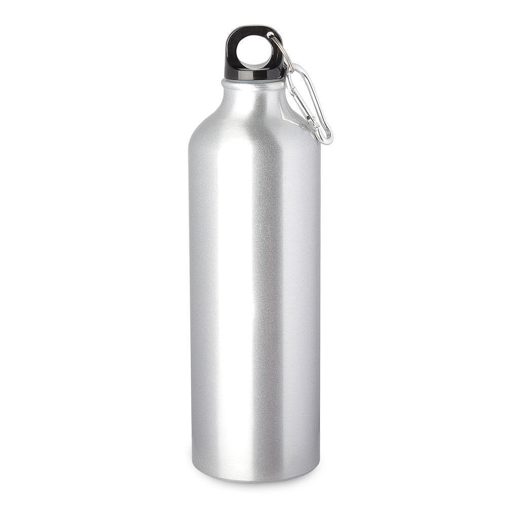 Garrafa em alumínio, tampa de plástico com mosquetão colorido. Capacidade de 750ml, com pintura metálica.