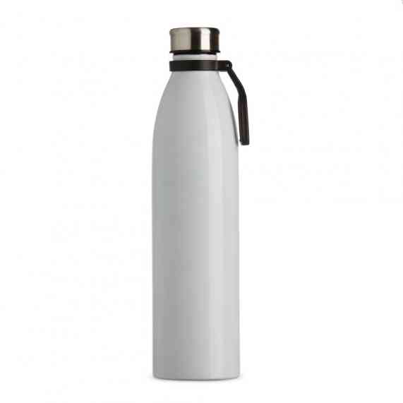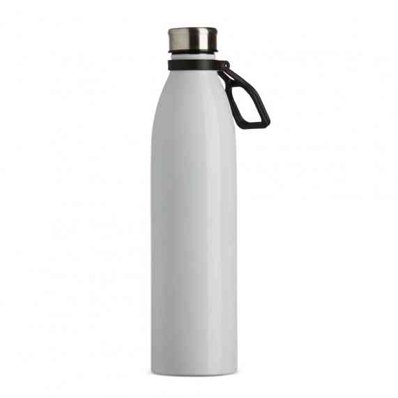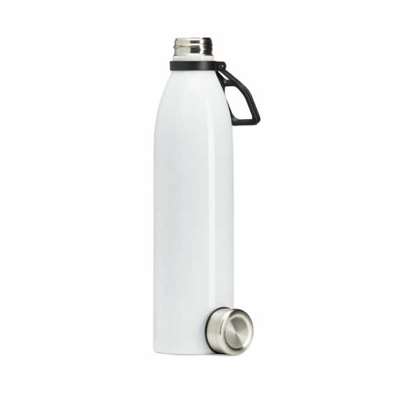 Garrafa de inox 1,1 litros com tampa rosqueável e alça plástica para transporte.