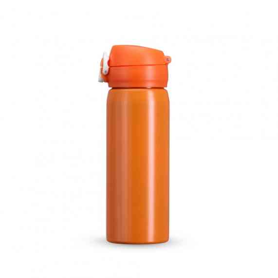Garrafa 500ml em inox com botão e válvula para abertura. Possui um sistema de trava (basta mover para cima/baixo para abrir/fechar) pressione o botão central para abrir a tampa.