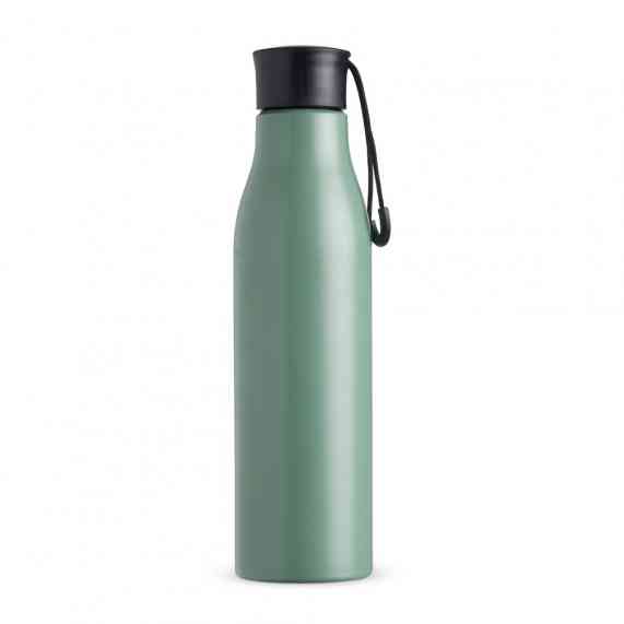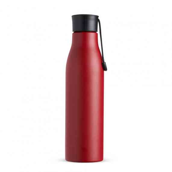 Garrafa inox 800ml com pintura colorida. Possui tampa rosqueável com alça para transporte.