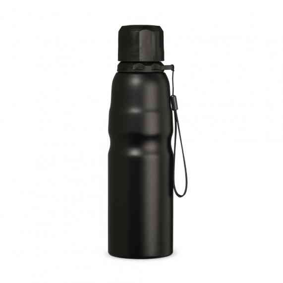 Garrafa inox 800ml com tampa plástica rosqueável e cordão para transporte.