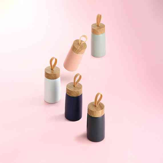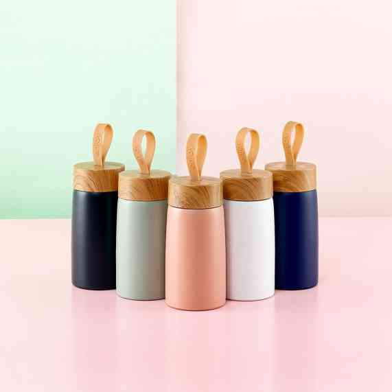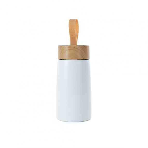 Garrafa inox 304 com parede dupla, capacidade de 250ml. Contém tampa plástica com design de bambu e alça de silicone para transporte.