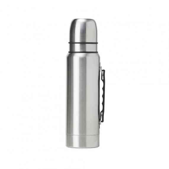 Garrafa térmica de inox com parede dupla e tampa dupla, capacidade de 1 litro. Com alça plástica para transporte, a garrafa contém duas tampas utilizáveis como copos.