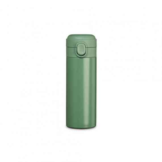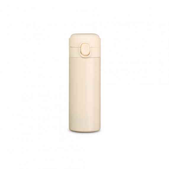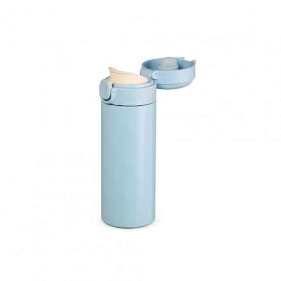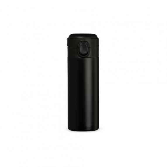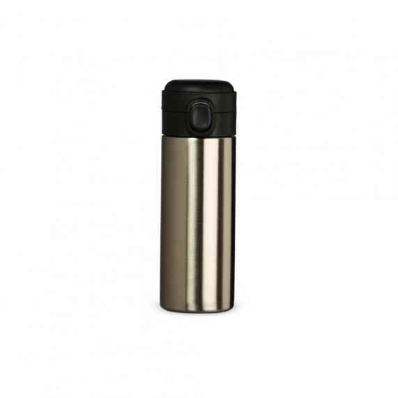 Garrafa térmica em inox com parede dupla, capacidade de 400ml. Tampa com botão central para abertura e borracha interna para vedação.