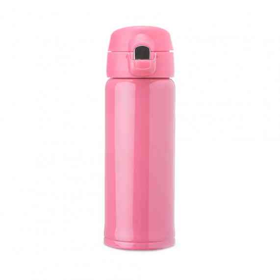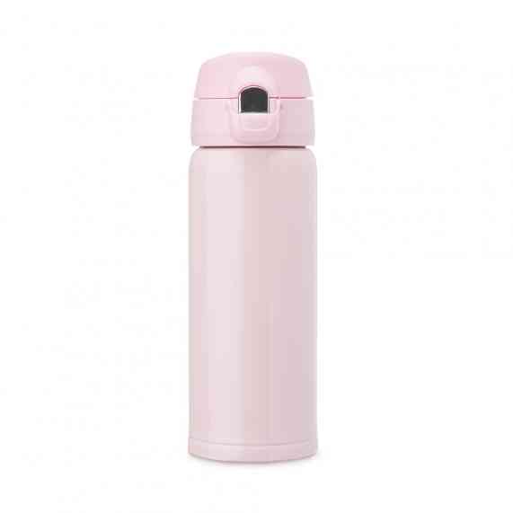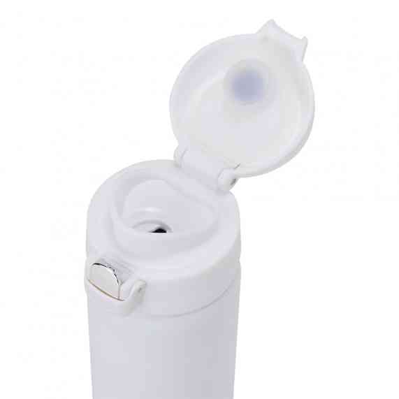 Garrafa térmica parede dupla feita inox 304, capacidade de 400ml. Tampa de polipropileno com botão de acionamento e trava de segurança.
