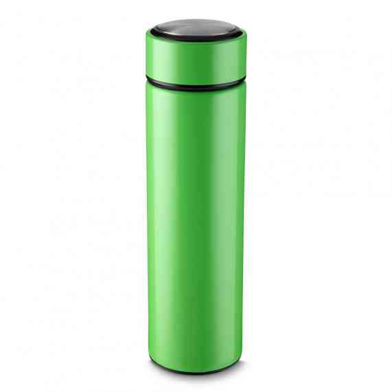 Garrafa térmica em aço inox com parede dupla isolada a vácuo, com capacidade até 450ml com infusor. Tampa rosqueável com anel de silicone para vedação.