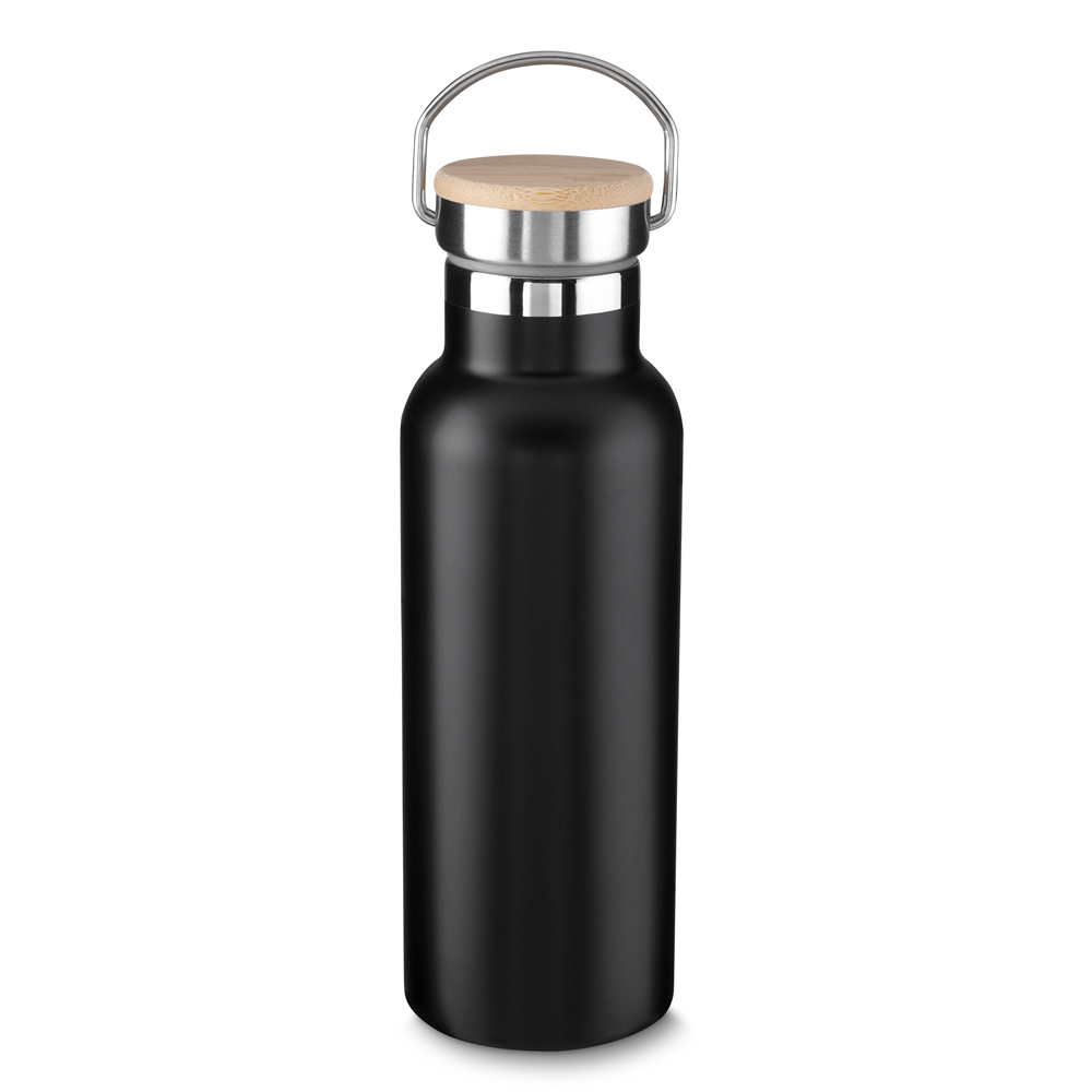 Garrafa térmica em aço inox com parede dupla isolada a vácuo, com capacidade de até 500ml. Tampa com revestimento em fibra de bambu. Alça em metal. Detalhe cromado. Pintura fosca.