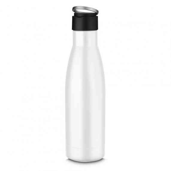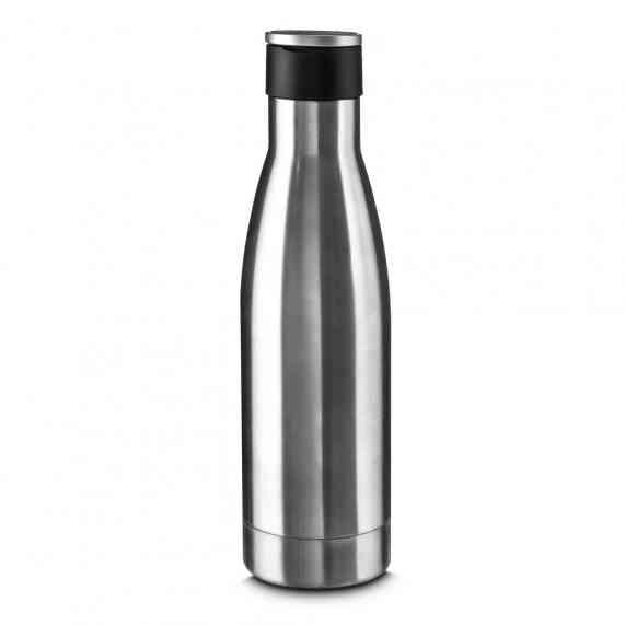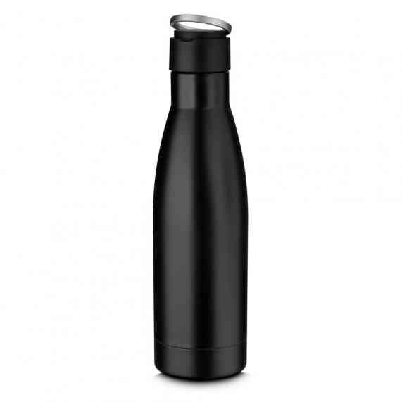 Garrafa térmica em aço inox isolada a vácuo com parede dupla, tampa de plástico com alça de transporte de aço inoxidável. Com capacidade de até 500ml.