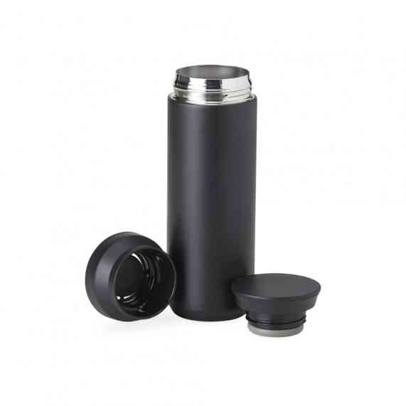 Garrafa térmica feita em inox 304 com parede dupla, capacidade de 510ml. Tampa de abertura dupla.