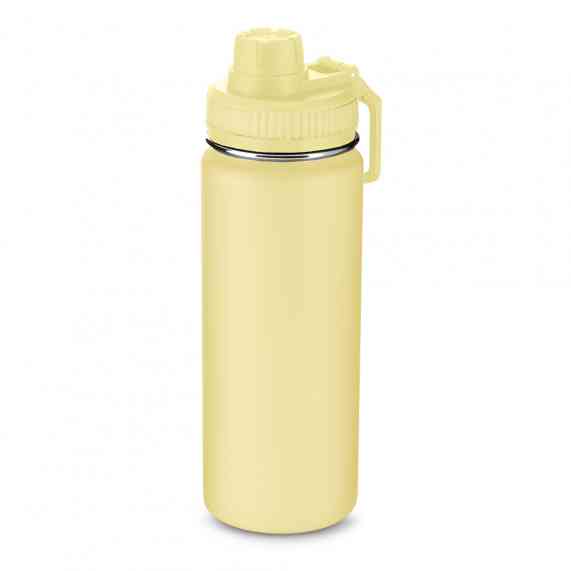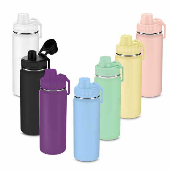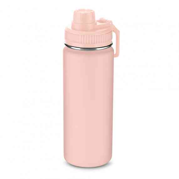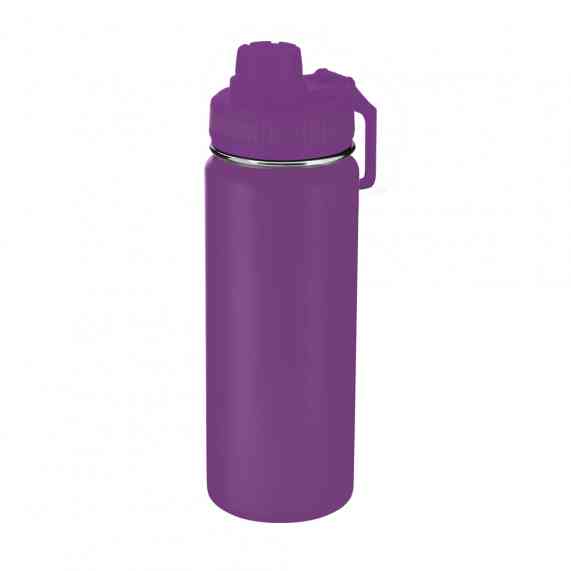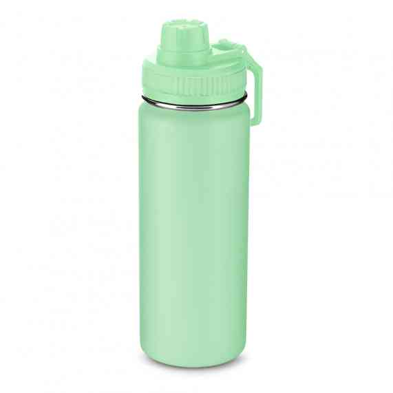 Garrafa térmica em aço inox com parede dupla com capacidade de até 570 ml. Tampa rosqueável, mosquetão em plástico e anel de silicone para vedação. Design com frisos na tampa e pintura pó.