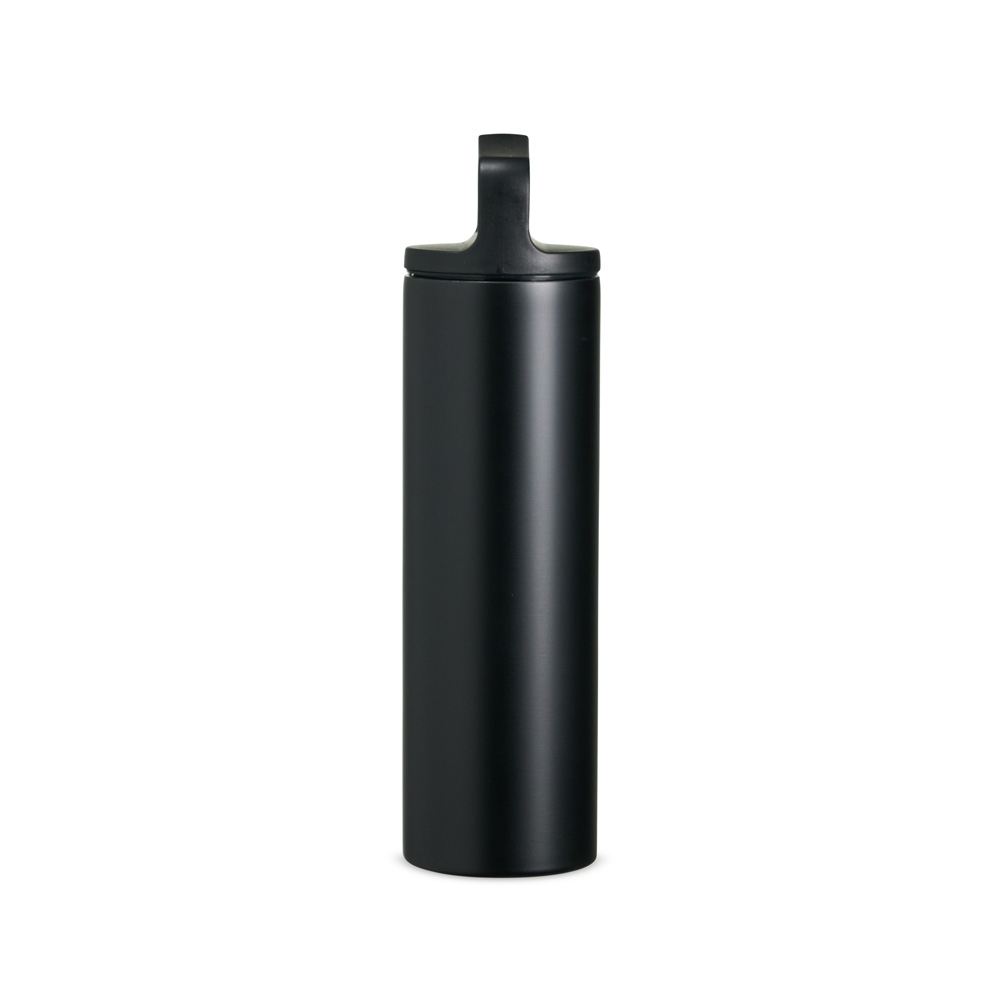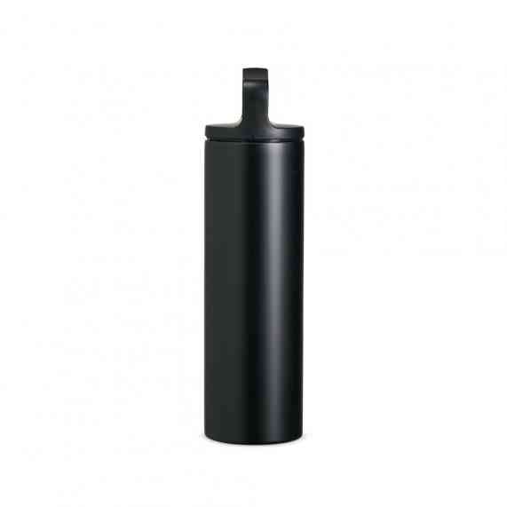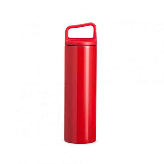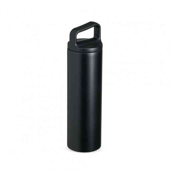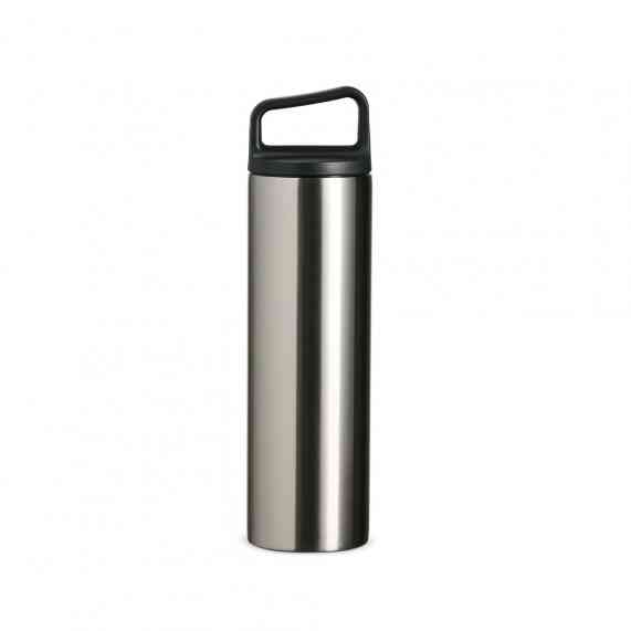 Garrafa térmica em inox, com parede dupla e capacidade de 600ml. A tampa é plástica rosqueável e possui alça acoplada.