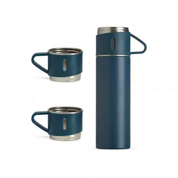 Kit garrafa térmica 450ml com duas tampas extras que podem ser utilizadas como xícaras. Garrafa produzida em inox com base antiderrapante e tampas de inox com revestimento plástico. Acompanha sacola de papel com berço de papelão para acomodação das peças.