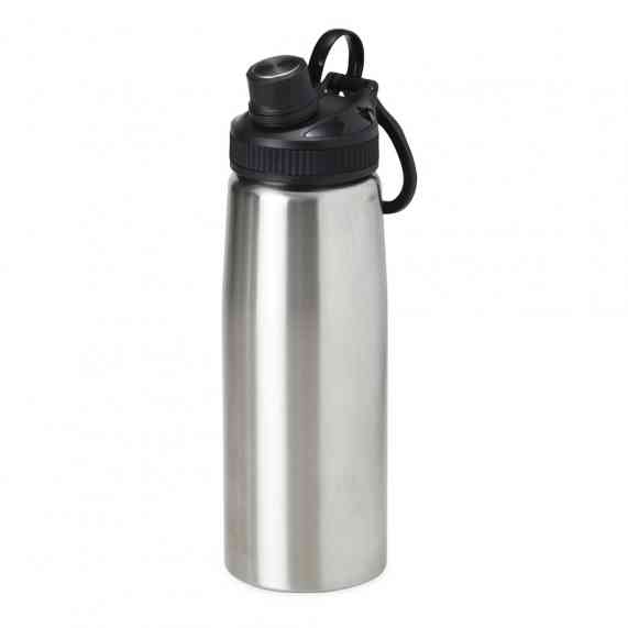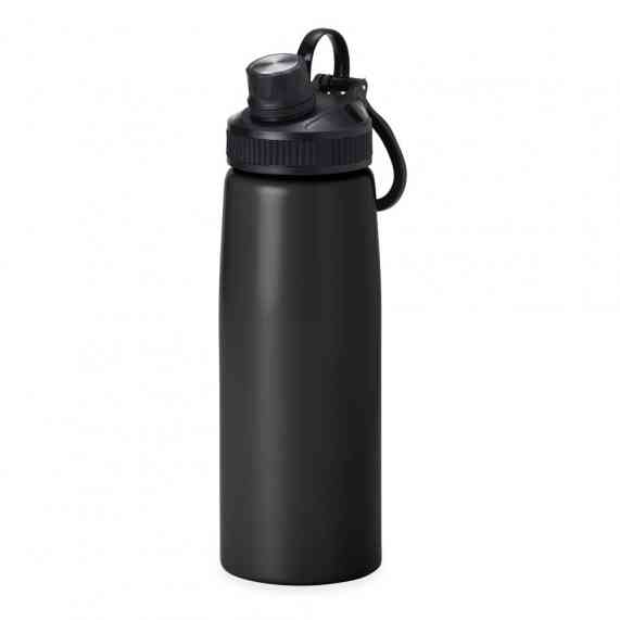 Squeeze inox 900ml com tampa plástica, bocal com tampa protetora e alça para transporte.