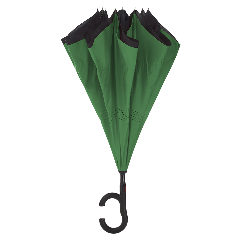 Guarda-chuva invertido com cabo plástico e haste de metal, botão acionador para abertura automática, tecido ponge chinês, seda crua Poliester 190T Pongee, oito varetas.