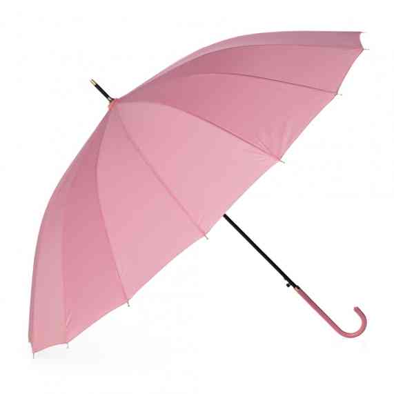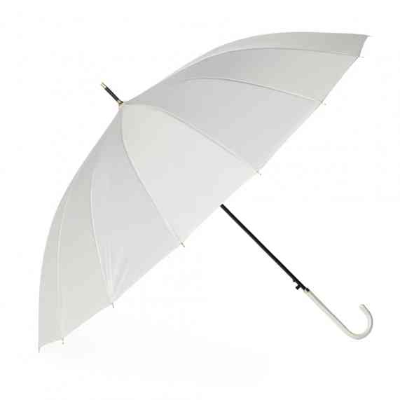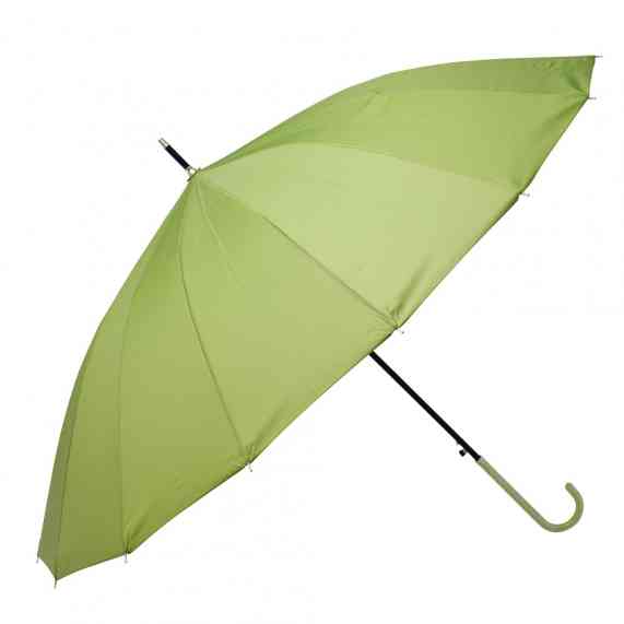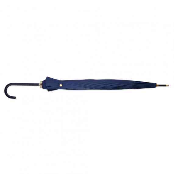 Guarda-chuva de poliéster com abertura automática, estrutura em aço e 16 varetas em fibra de vidro. Possui pegador em couro sintético com botão de acionamento.