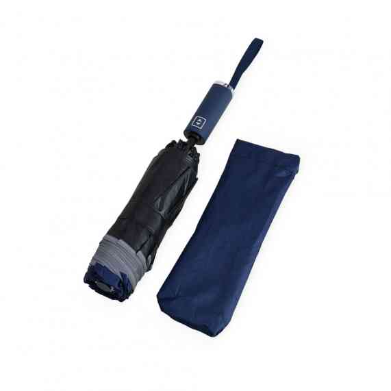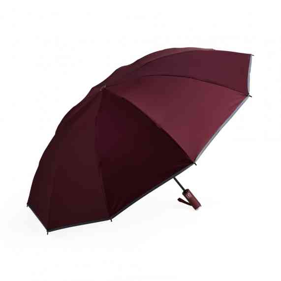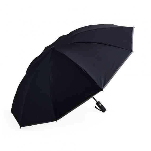Guarda-chuva automático em poliéster de impacto impermeável com bordas refletivas, possui estrutura em aço e 10 varetas em fibra de vidro. Possui pegador plástico com botão acionamento e alça de nylon para transporte. Acompanha capa de proteção.