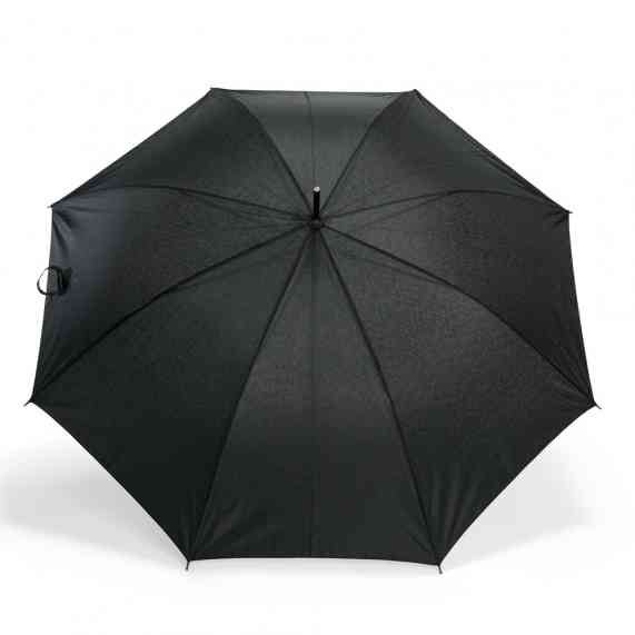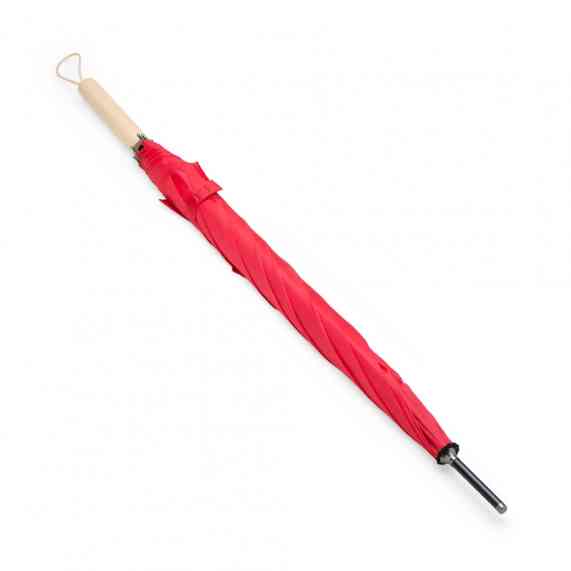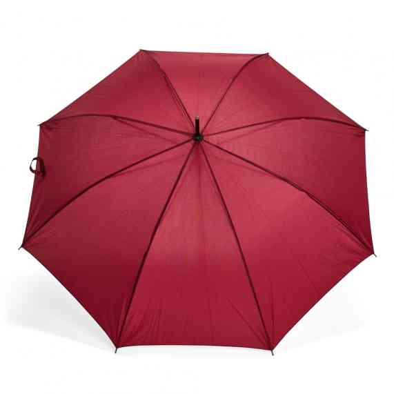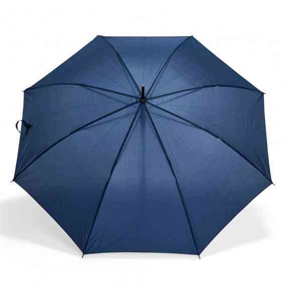 Guarda-chuva com abertura automática, estrutura em aço e 8 varetas em fibra de vidro. Possui pegador de madeira com alça de nylon e botão de acionamento.