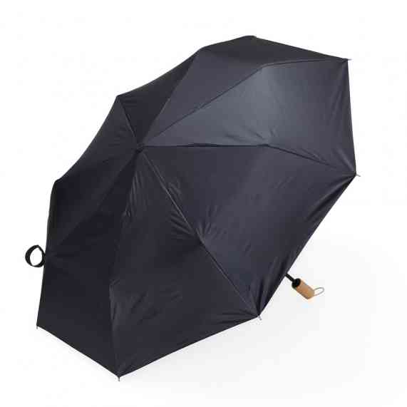 Guarda-chuva manual de nylon com impacto impermeável e proteção UV, tecido interno em vinil. Com 8 varetas e estrutura em aço, possui botão de abertura e pegador de madeira com alça de nylon. Acompanha capa protetora.