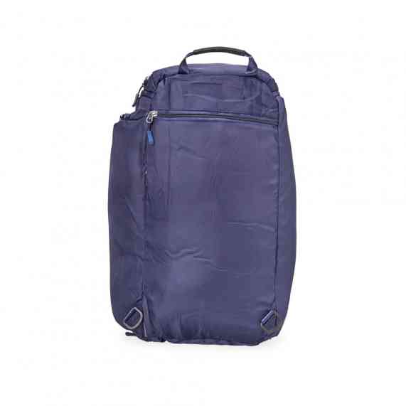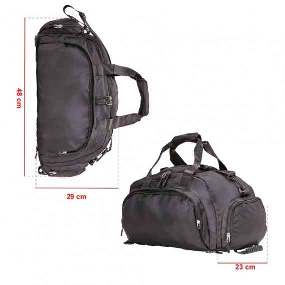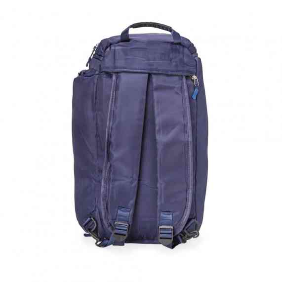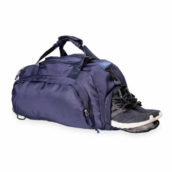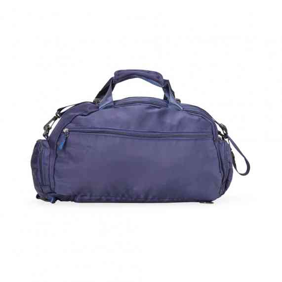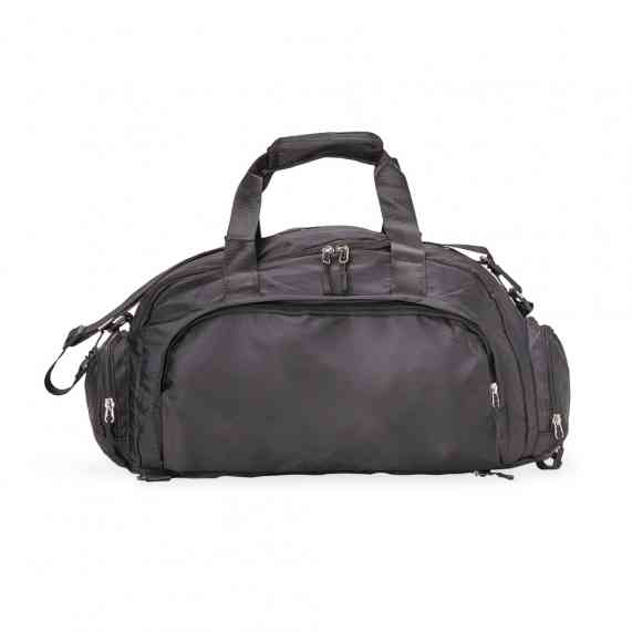 Bolsa esportiva de 32 litros em poliéster de impacto impermeável com cinco compartimentos, sendo três deles exclusivos para tênis, itens molhados e armazenamento das alças de costas. Com alça transversal removível e alça de mãos com suporte de juntura, a bolsa contém alças de compensação e alças para as costas ocultas no compartimento inferior, podendo ser transportada como mochila.