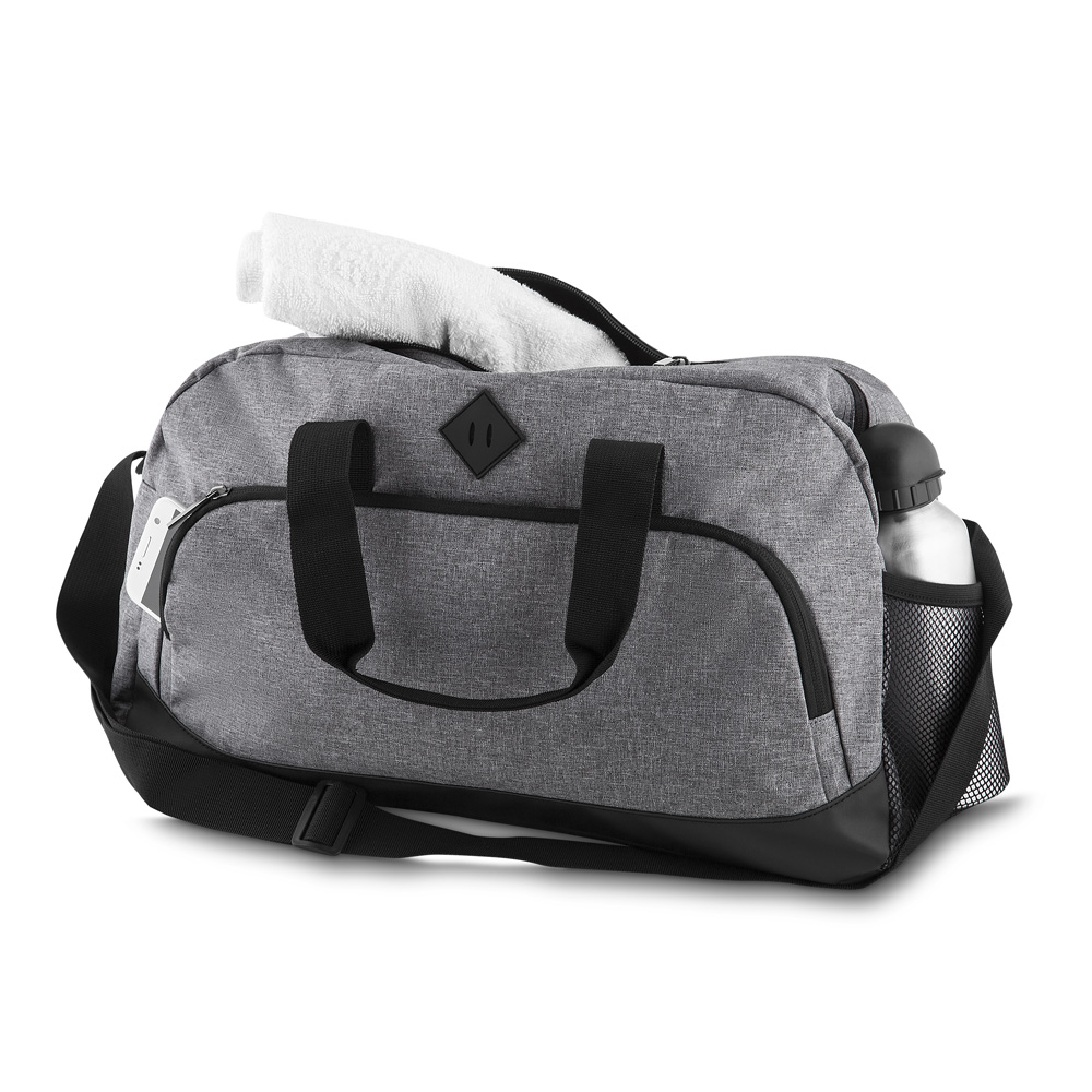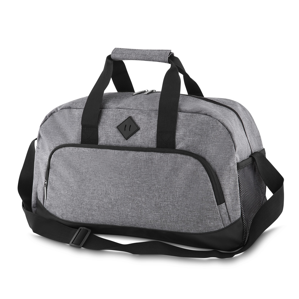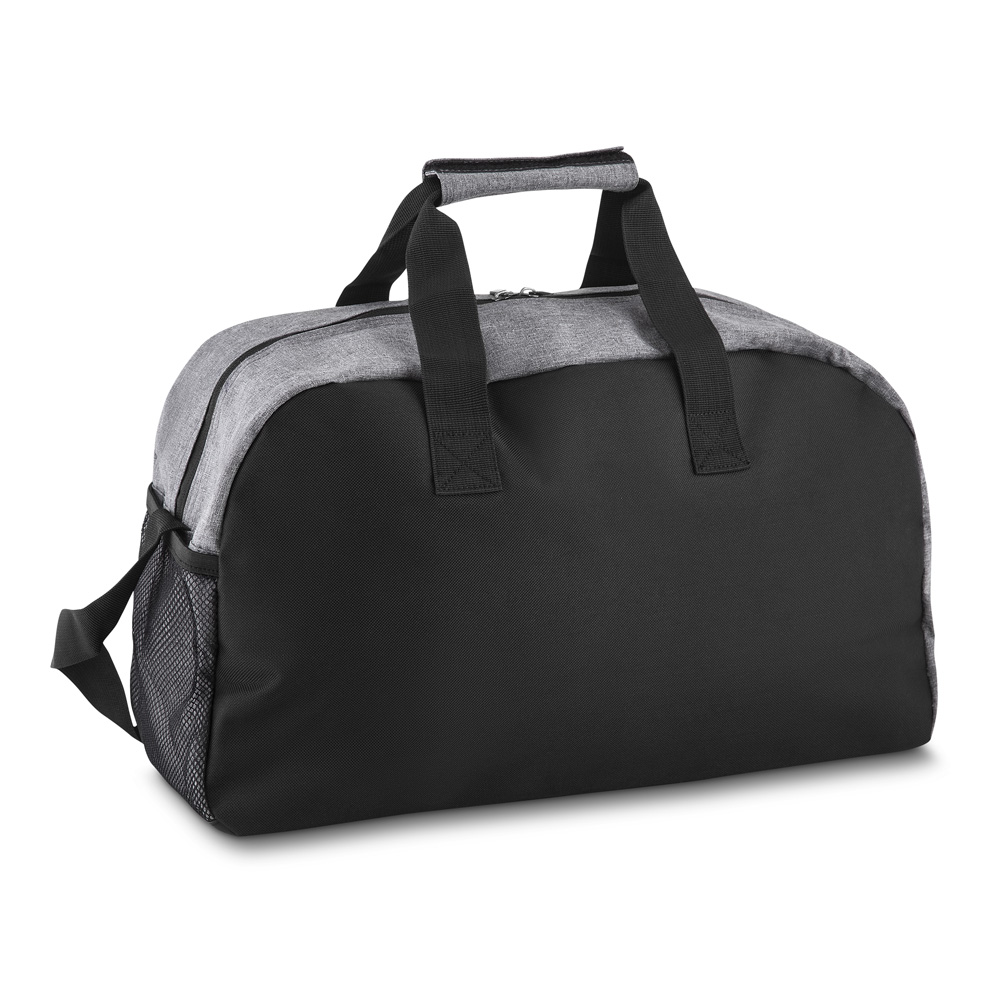 Mala esportiva em Poliéster com alça de mão e ombro. Bolso frontal e lateral.