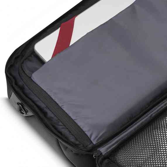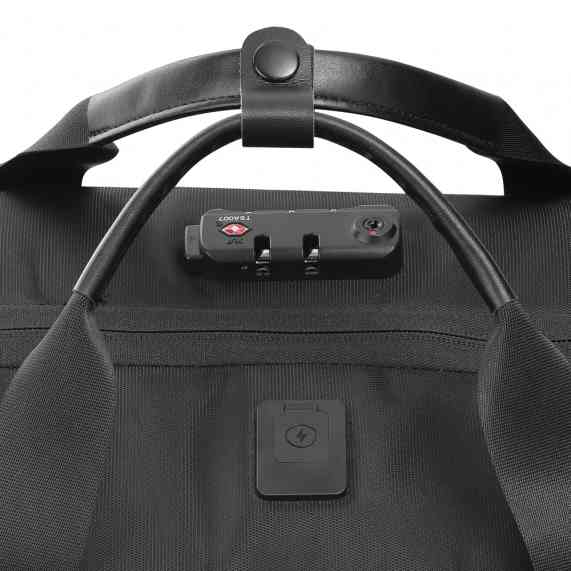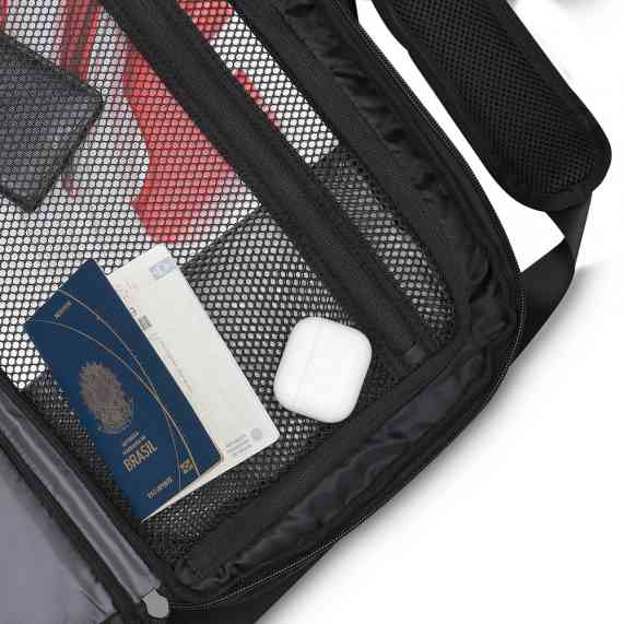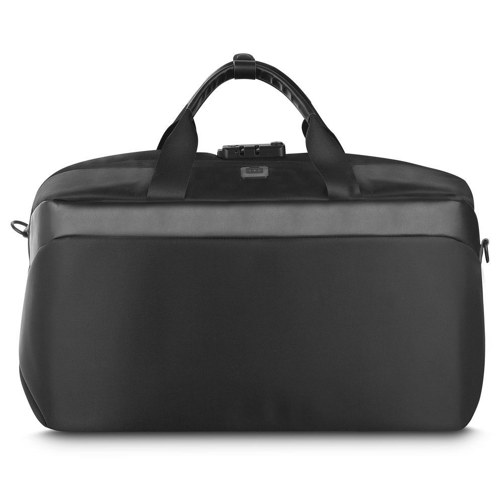 Mala executiva em poliéster, compartimento interno com zíper, alça de ombro e mão, entrada usb, cadeado com senha/segredo, cadeado tipo TSA e compartimento para notebook de até 15,6".
