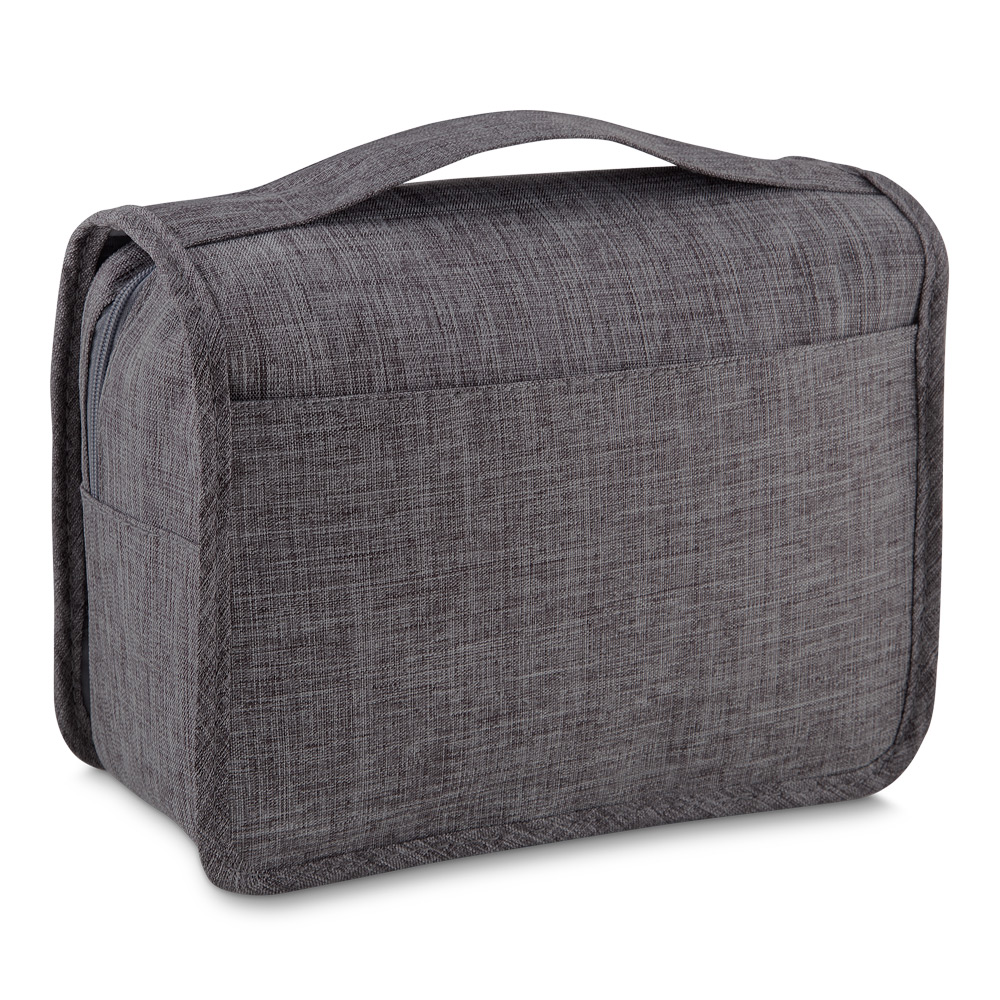 Necessaire em tecido poliéster, com excelente espaço interno, bolso frontal e no verso com suporte para pendurar.