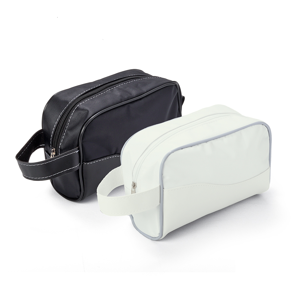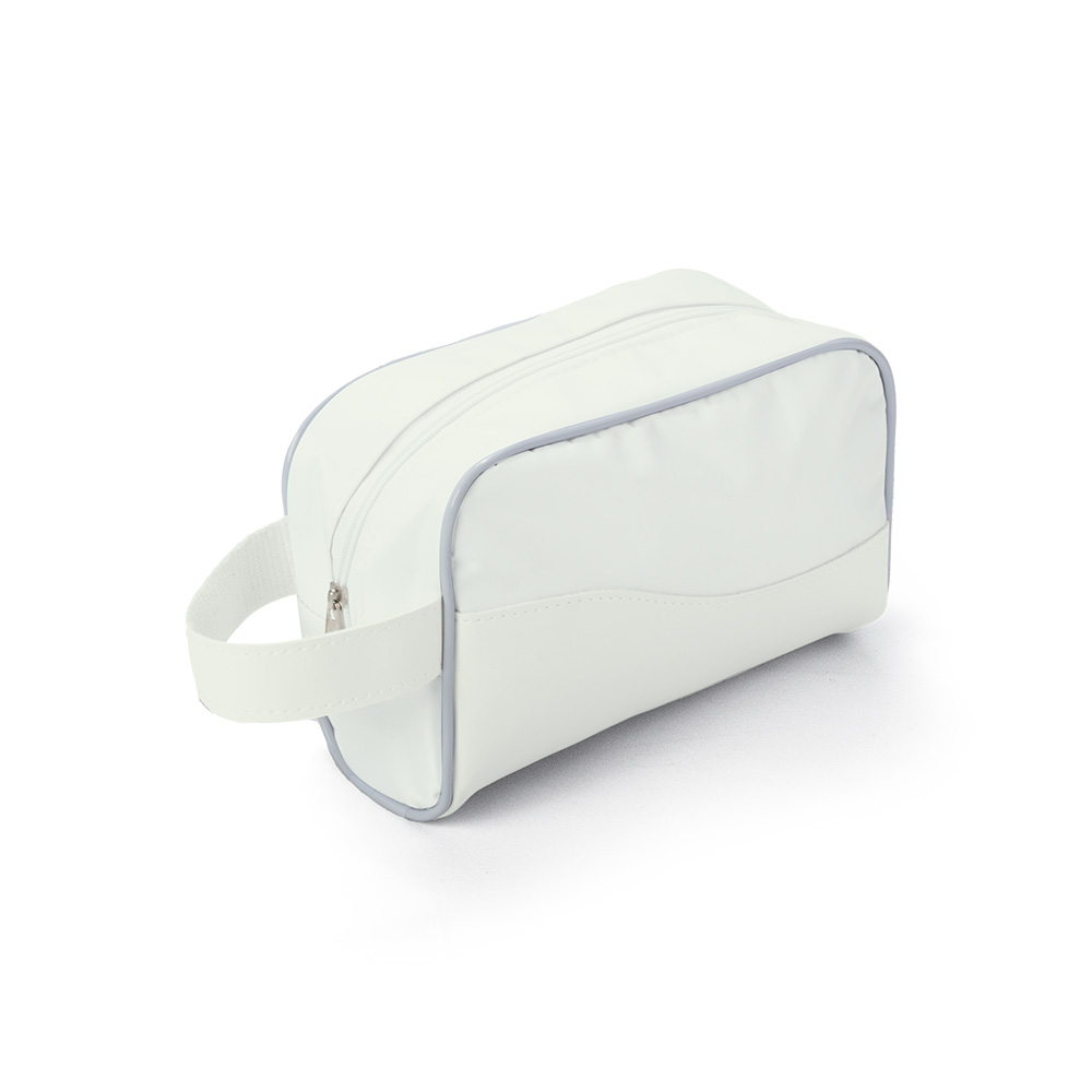 Nécessaire em couro sintético no tecido externo e forro sintético Bidim, e alça lateral, Gravação frontal na opções: serigrafia e plaquinha.